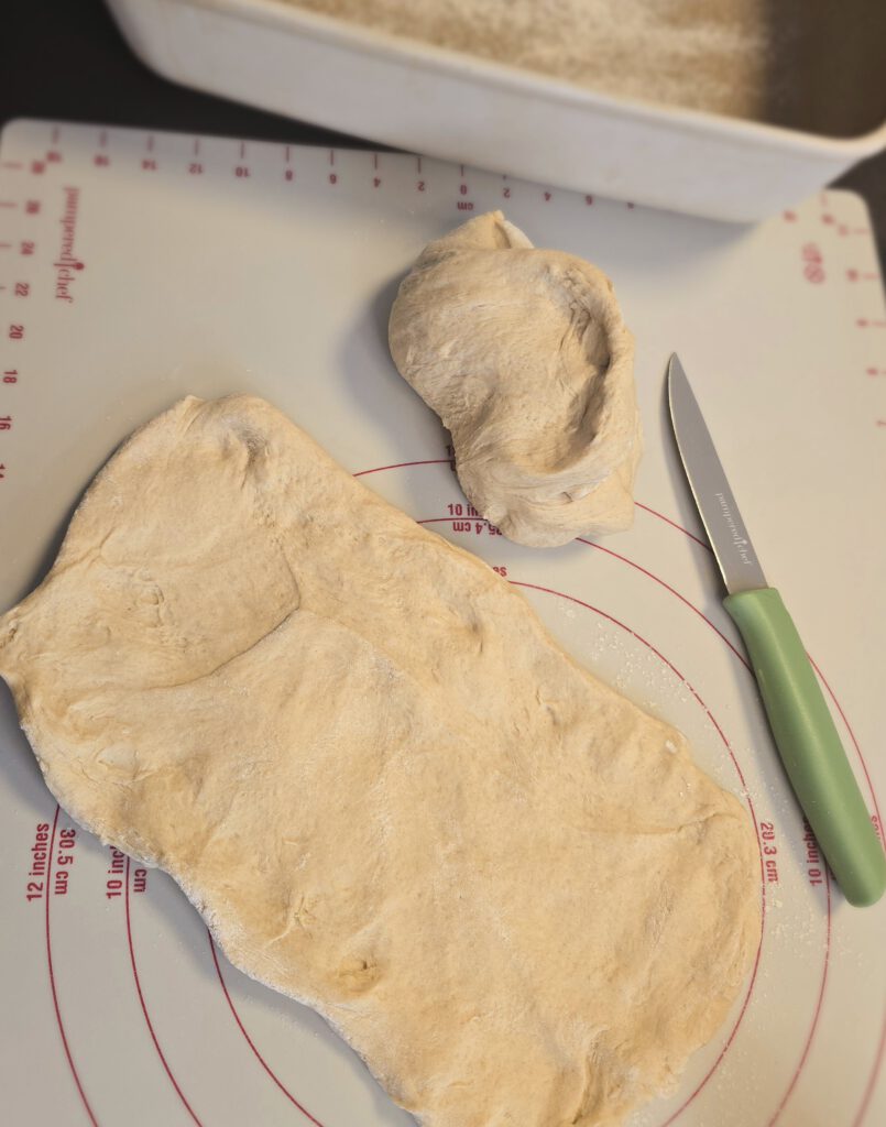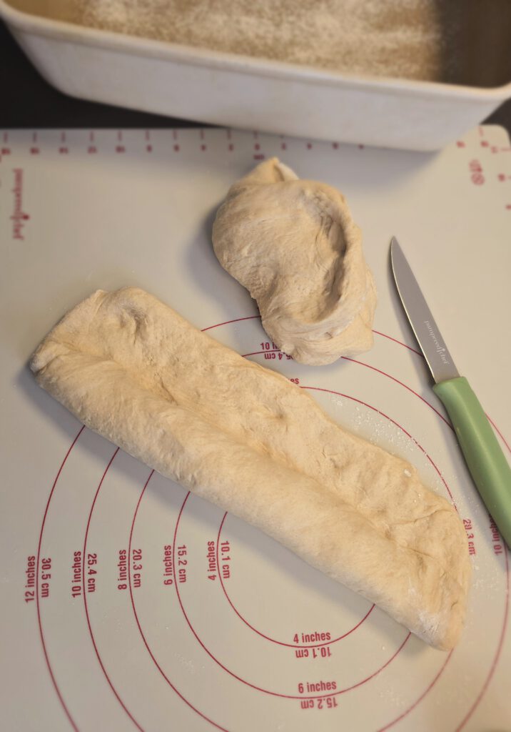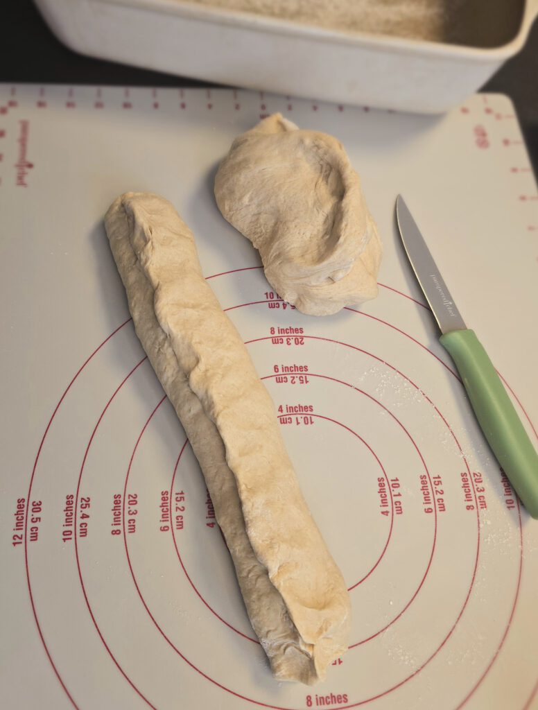 - Teig auf die leicht bemehlte Teigunterlage geben und mit dem Teigschneider oder dem Nylonmesser in zwei gleich schwere Stücke teilen