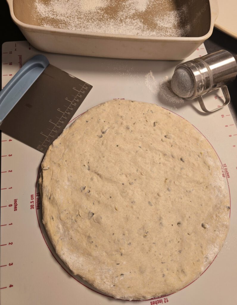 - Teig auf die bemehlte Teigunterlagen geben und kreisförmig flach drücken