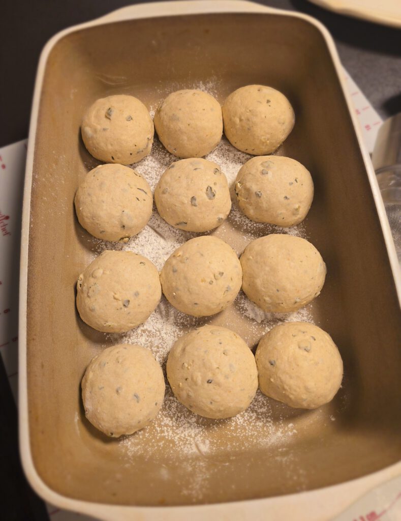 - Jeden Teigling unter Zugabe von etwas Mehl aus dem Streufix mehrmals falten und rund schleifen