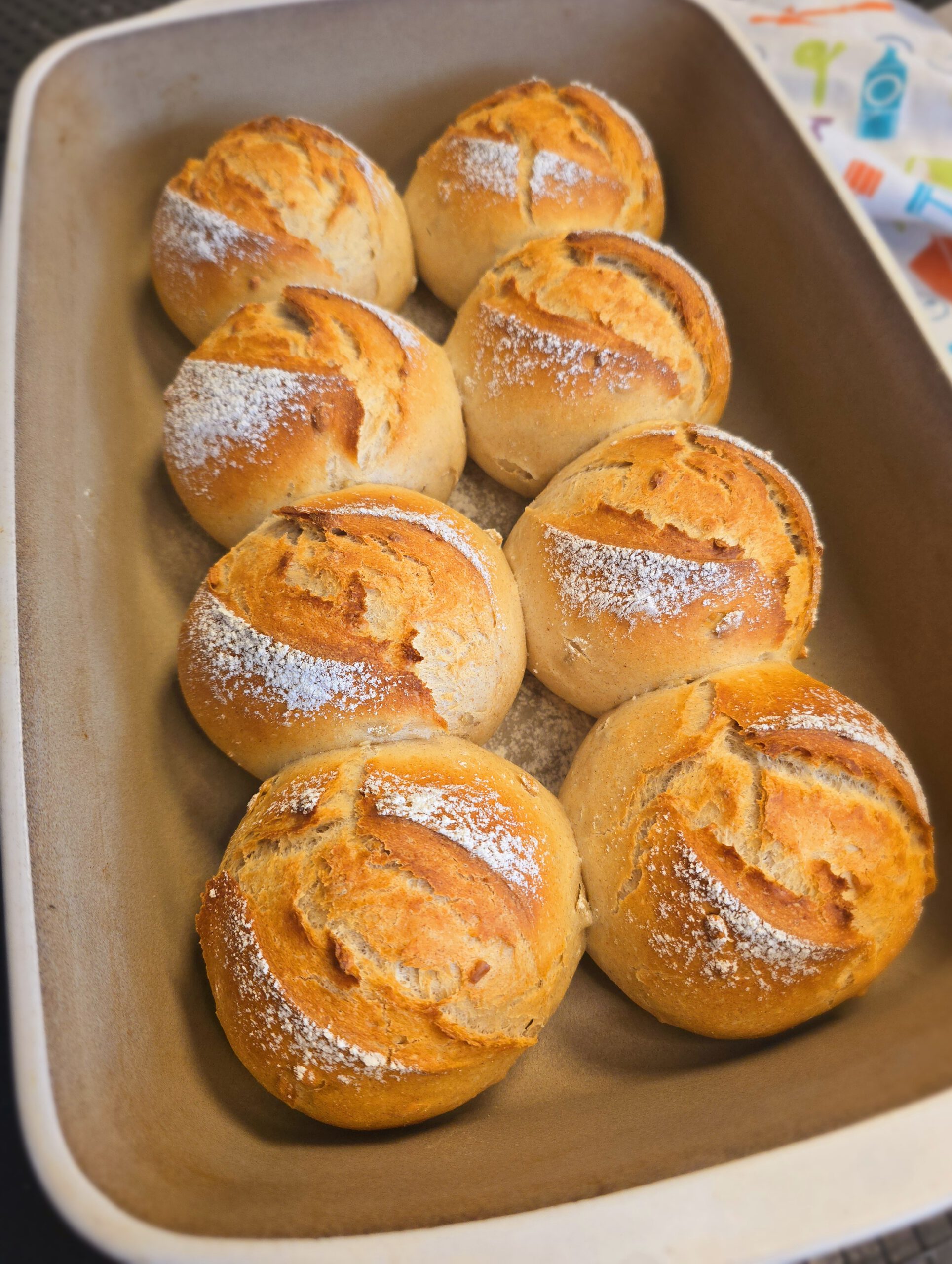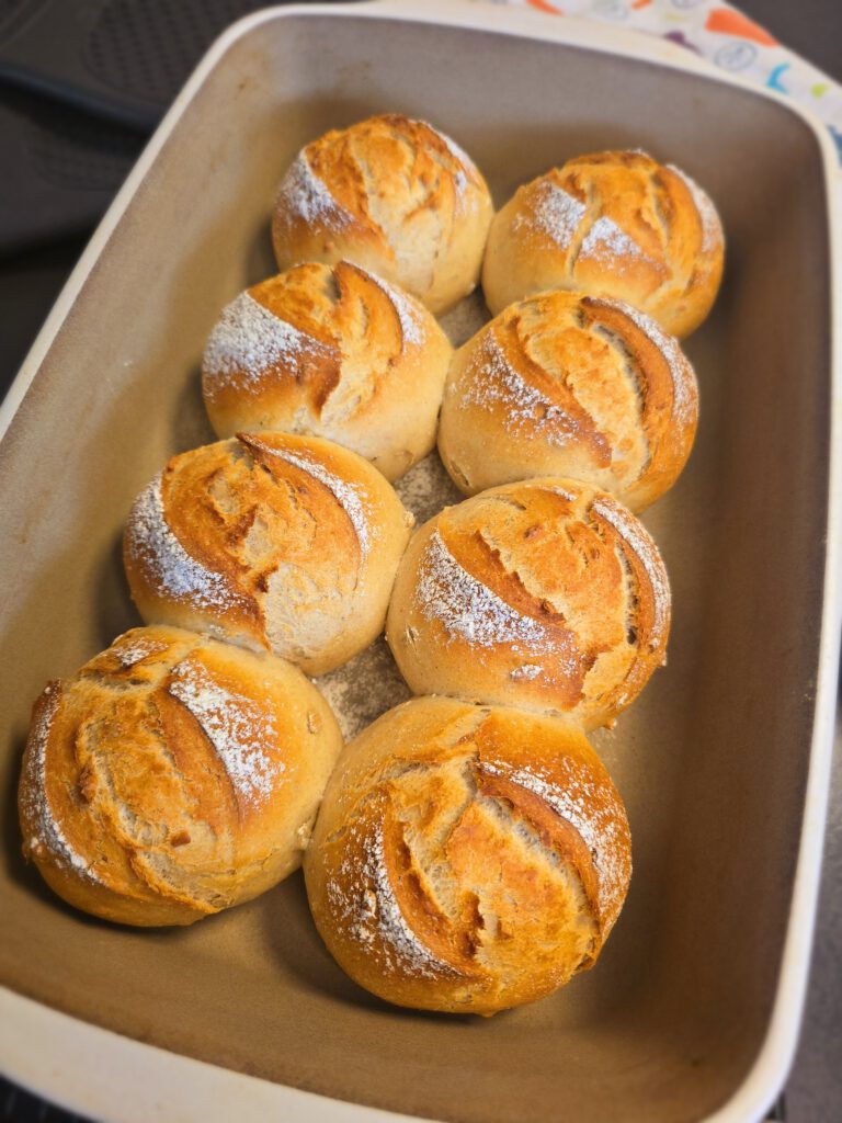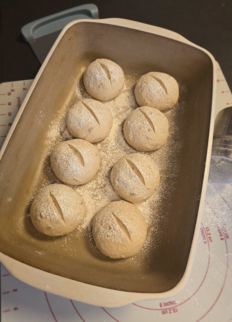 - Jeden Teigling mehrmals falten und rund schleifen.Teiglinge in die Ofenhexe setzen