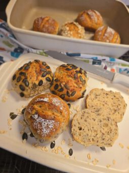 - Die Oberseite nach Wunsch mit Wasser bepinseln und in Körner oder Haferflocken drücken und einschneidenKörner zum Bestreuen