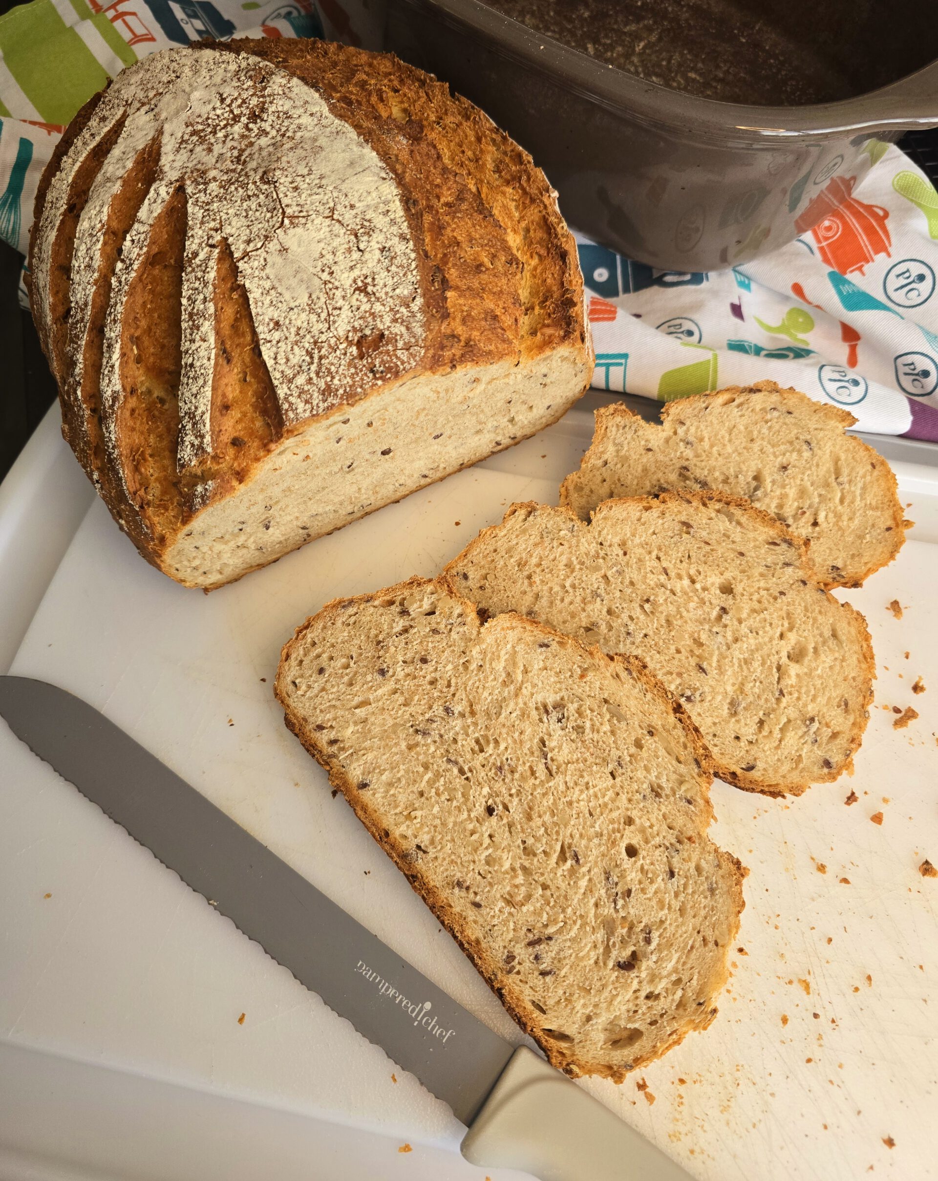 400 gr. Dinkelmehl 630er, 200 gr. Dinkelvollkornmehl, 100 gr. Roggenmehl 1150er, 15 gr. Salz, 30 gr. Leinsamen, 50 gr. Sonnenblumenkerne, 150 gr. griechischer Joghurt