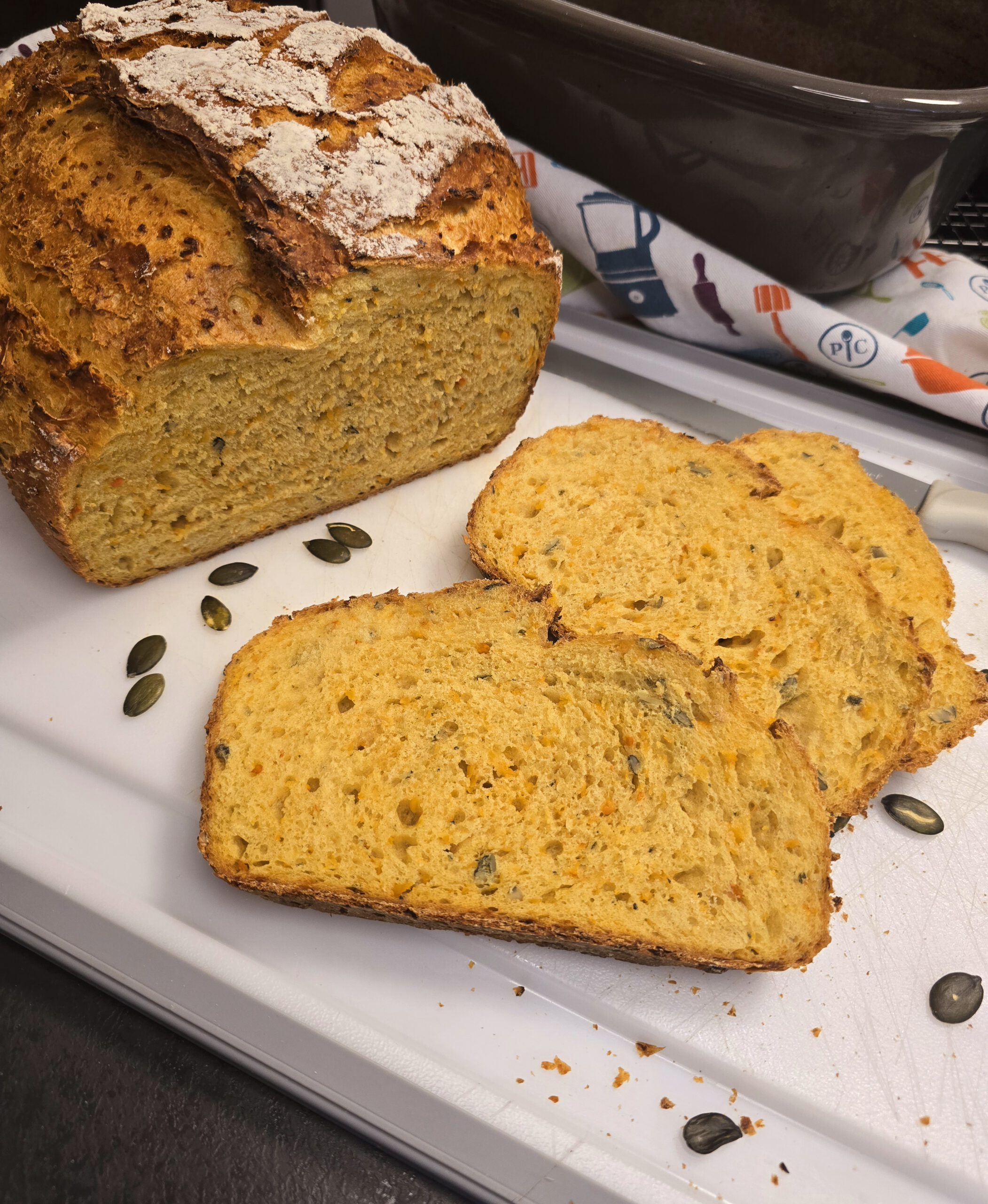 - Alle Mehlsorten, Kürbiskerne, Salz und Kürbis dazu geben3 Min. / Knetstufe450 gr. Dinkelmehl 630er, 180 gr. Roggenmehl 1150er, 100 gr. Dinkelmehl 1050er, 40 gr. Kürbiskerne, 12-15 gr. Salz