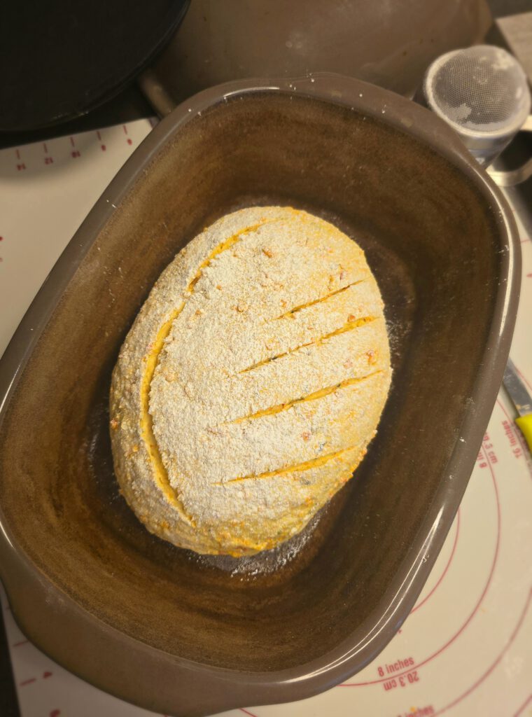 - Teigling in den Ofenmeister legen, bemehlen und einschneiden