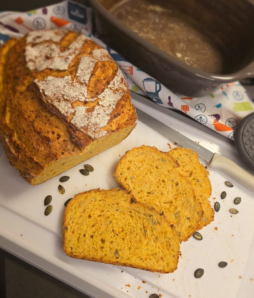 - Alle Mehlsorten, Kürbiskerne, Salz und Kürbis dazu geben3 Min. / Knetstufe450 gr. Dinkelmehl 630er, 180 gr. Roggenmehl 1150er, 100 gr. Dinkelmehl 1050er, 40 gr. Kürbiskerne, 12-15 gr. Salz