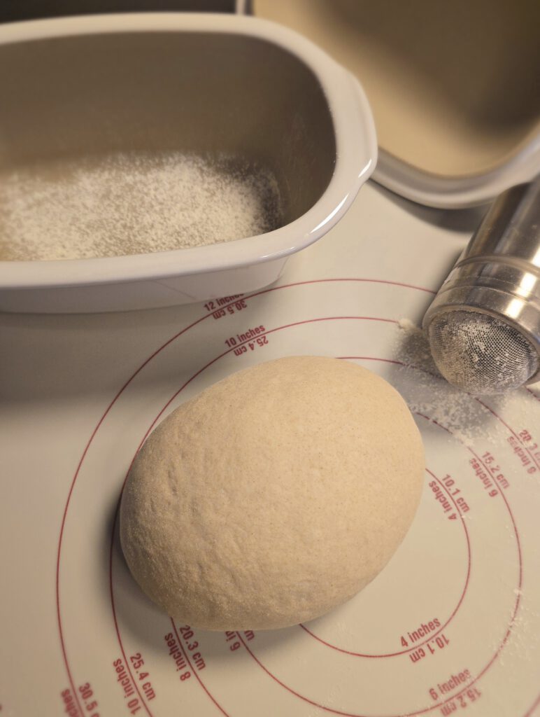 - Teig auf die bemehlte Teigunterlage geben und mehrmals falten und zu einem Brotlaib formen