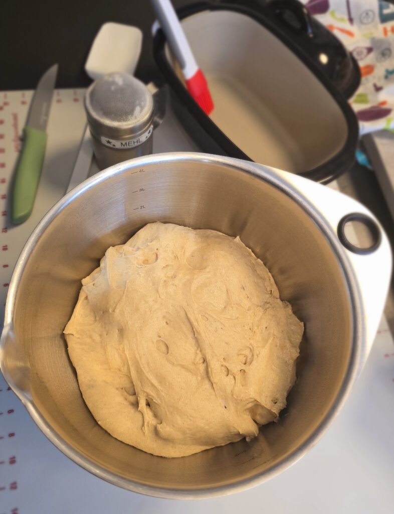 - Alle Mehlsorten, Salz und Balsamico dazu geben3 Min. / Knetstufe300 gr. Dinkelmehl 630er, 100 gr. Roggenmehl 1150er, 100 gr. Dinkelmehl 1050er, 12 gr. Salz, 1 EL Balsamico hell