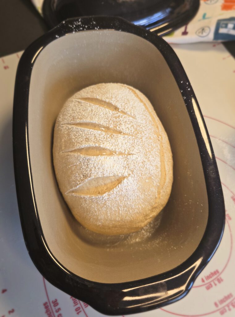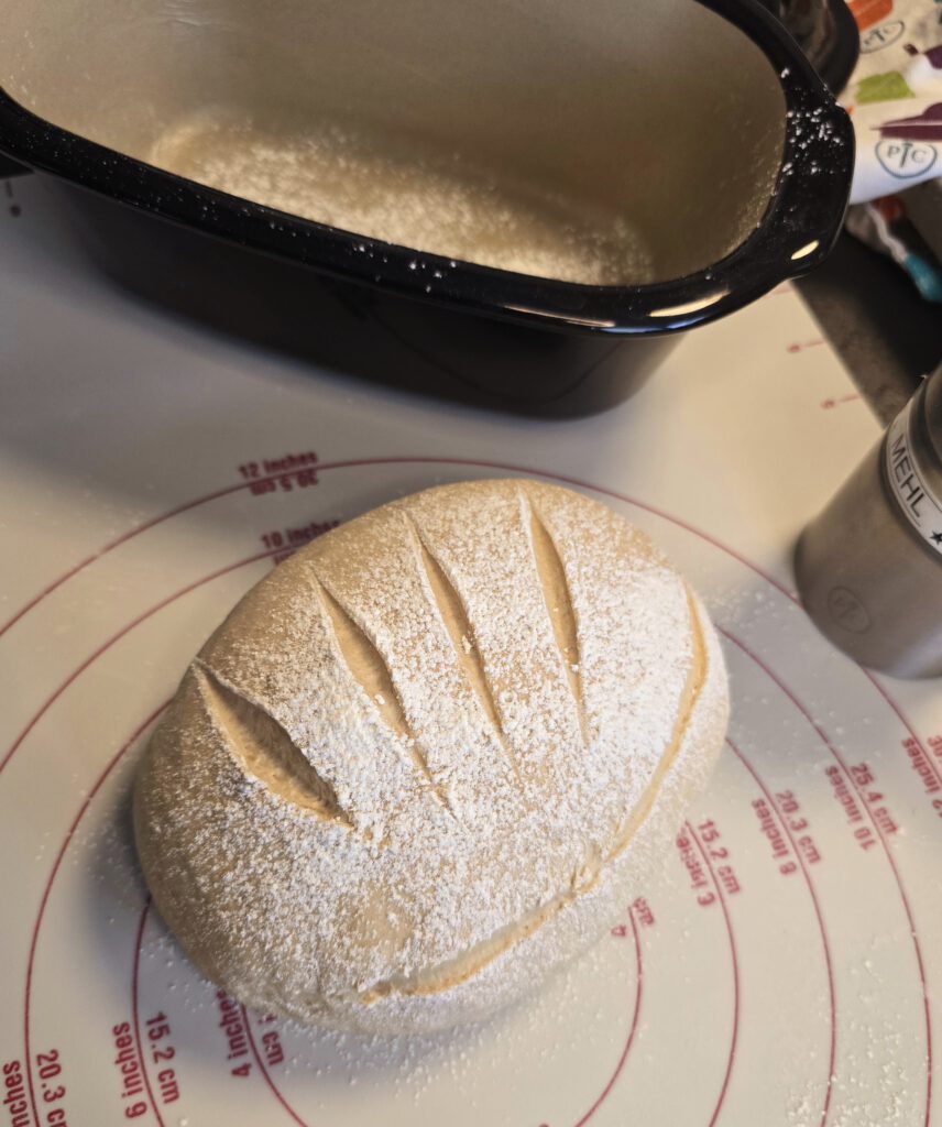 - Teig mehrmals falten, rund schleifen und zu einem Brotlaib formen