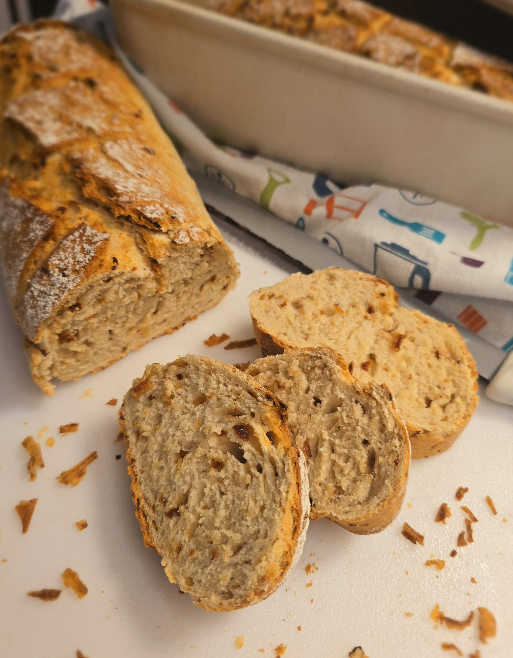 - Beide Mehlsorten, Öl, Salz, Kräuter und Röstzwiebeln dazu geben3 Min. / Knetstufe350 gr. Dinkelmehl 630er, 170 gr. Dinkelmehl 1050er, 12 gr. Salz, 1 TL ital. Kräuter (getrocknet), 1 EL Olivenöl, 50 gr. Röstzwiebel