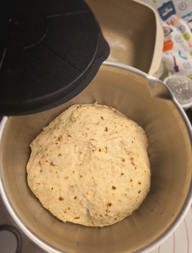 - Teig in die mittlere Edelstahlschüssel geben und etwa 1 Stunde gehen lassen