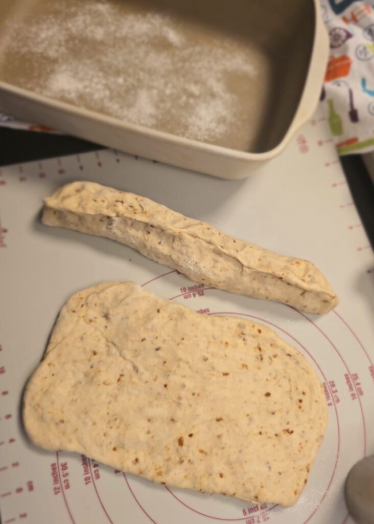 - Teig auf die bemehlte Teigunterlage geben und in zwei gleich schwere Stücke teilen