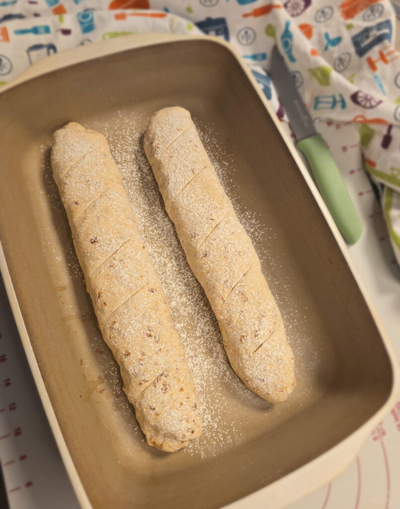 - Teiglinge in die Ofenhexe legen, bemehlen und einschneiden.