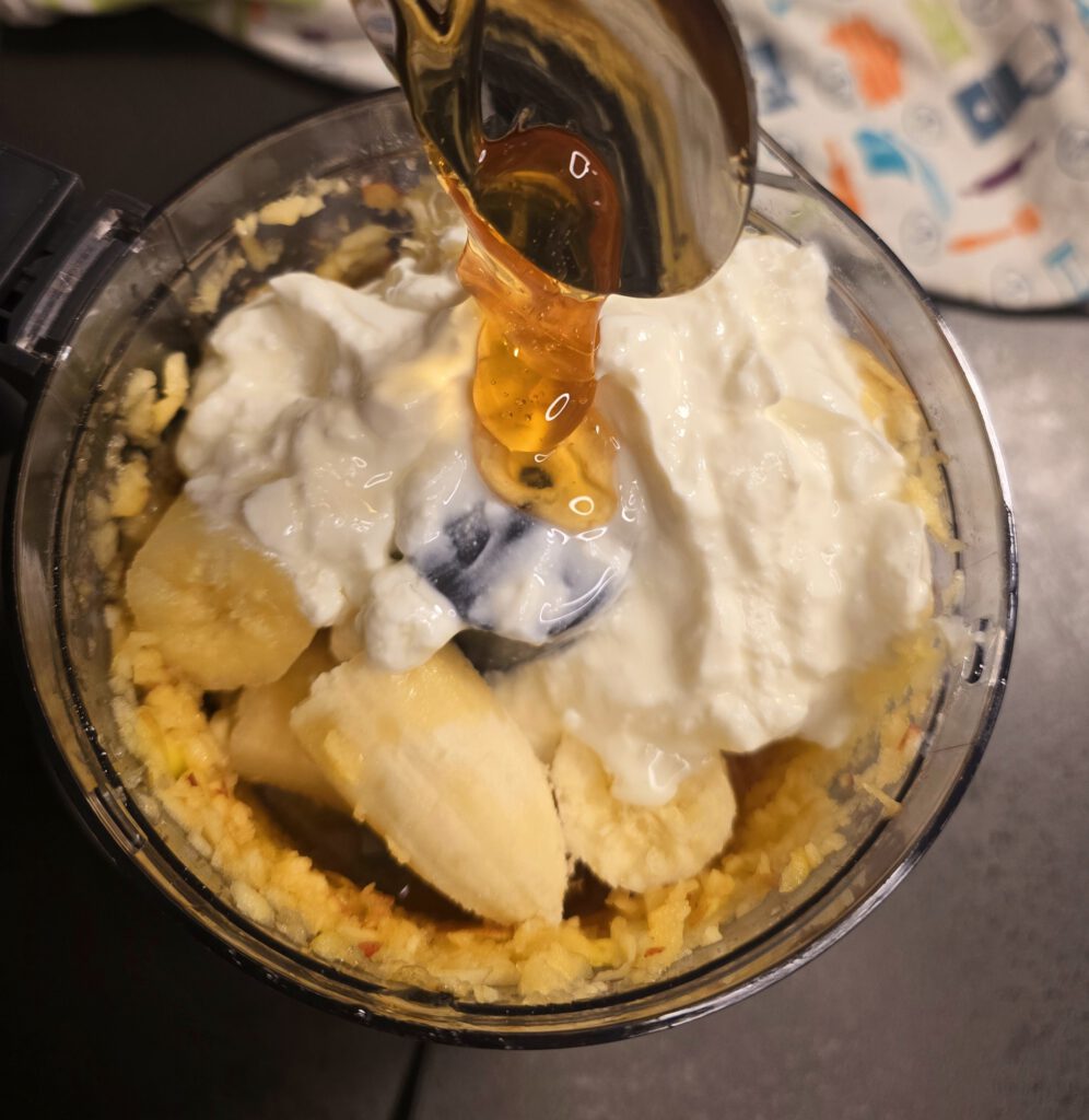 • Bananen in Stücken, Eier, Joghurt, Öl und Honig dazu geben