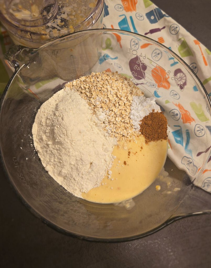 • Teig in die Nixe umfüllen. Mehl, Haferflocken, Backpulver, Zimt und Salz dazu geben