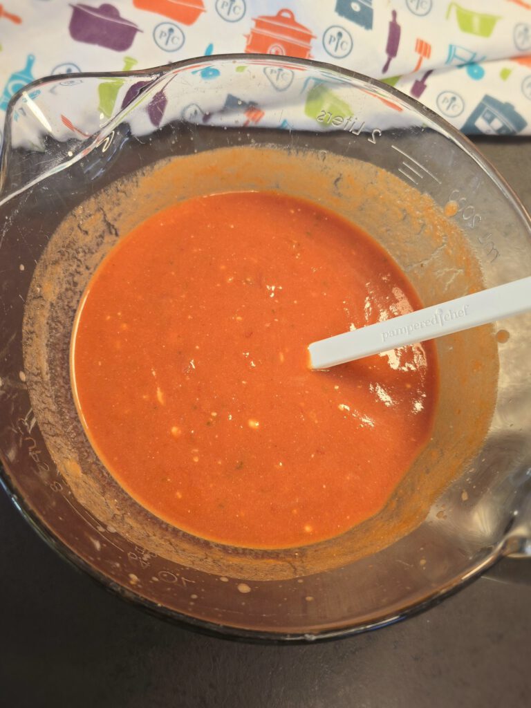 - In der Zwischenzeit passierte Tomaten, stückige Tomaten, Creme fraiche, Ajvar, Gemüsebrühe, Salz, Zucker und Paprika in der großen Nixe miteinander verrühren1 P. passierte Tomaten, 1 D. stückige Tomaten, 120 gr. Creme fraiche legere Kräuter, 3 TL Ajvar mild, 1 TL Gemüsebrühe / paste, 1 TL Salz, 1 TL Zucker, 1 TL Paprika edelsüß