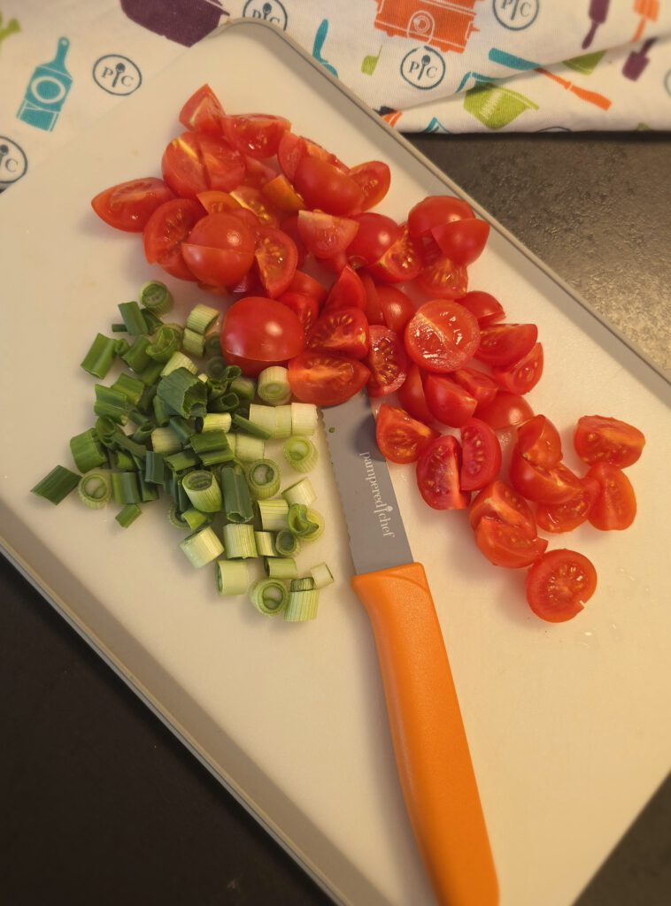 - Frühlingszwiebeln in Ringe schneiden, Tomaten vierteln3 Frühlingszwiebeln, 200 gr. kleine Tomaten
