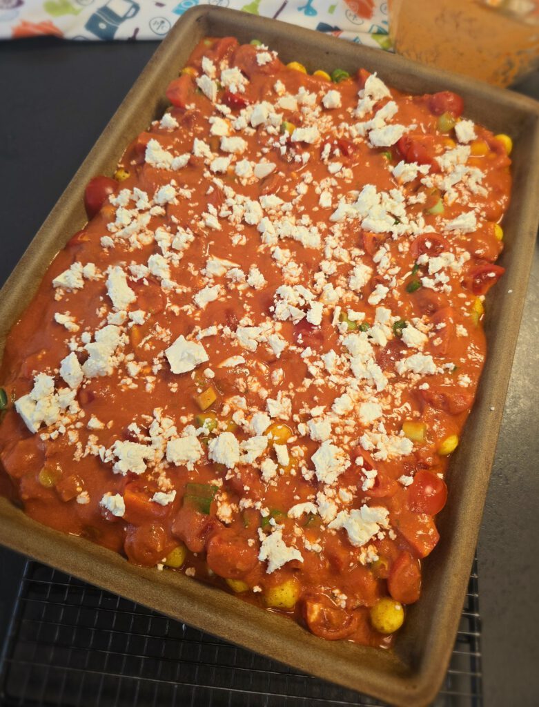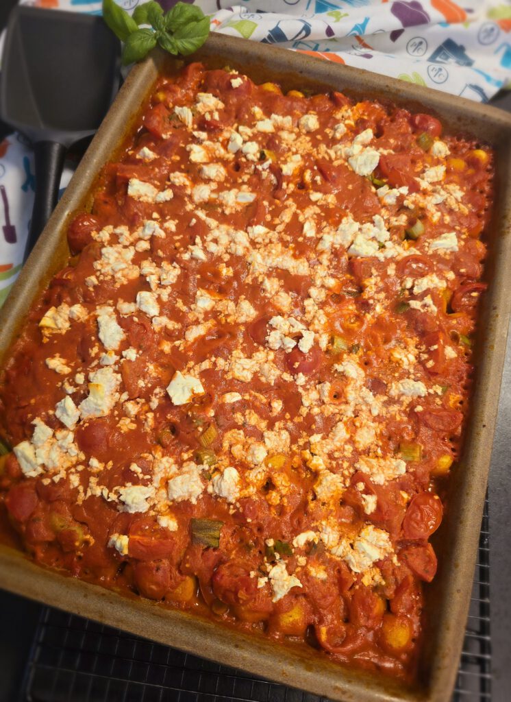 - Frühlingszwiebeln und Tomaten über den Gnocchis verteilen150 gr. Feta leicht