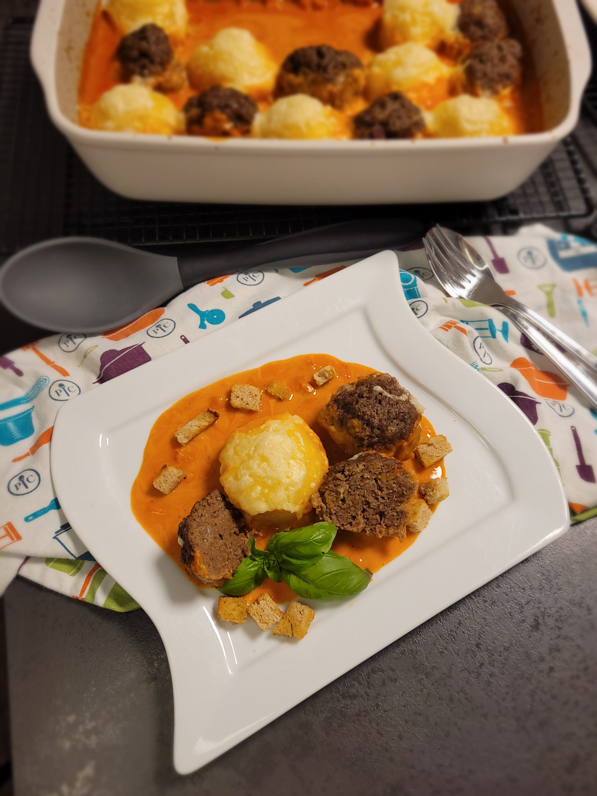 • Knödel und Hackbällchen auf der Soße in der Ofenhexe verteilen