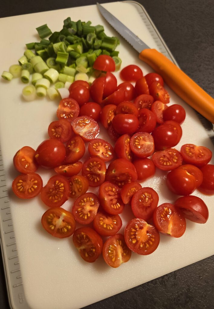 - Tomaten halbieren, Frühlingszwiebeln in Ringe schneiden250 gr. Cocktailtomaten, 3 Frühlingszwiebeln