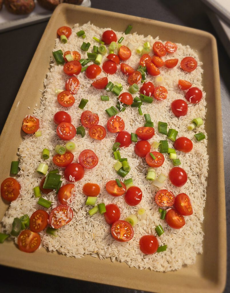 - Tomaten und Frühlingszwiebeln auf dem Reis verteilen