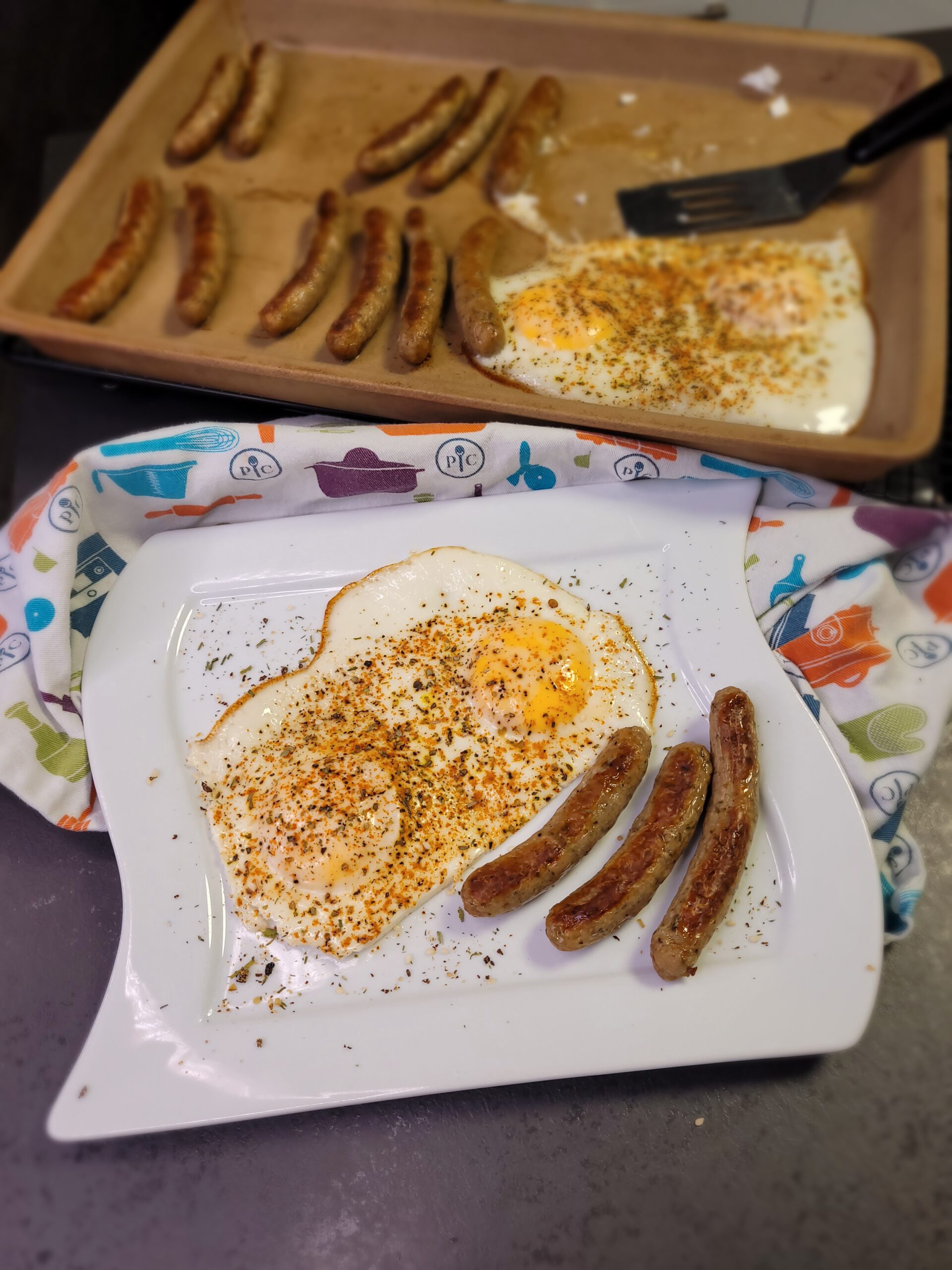 - Nach der Backzeit die Würstchen auf eine Seite des großen Ofenzauberers legen und die Spiegeleier auf die auf der anderen Seite verteilen4-5 Eier