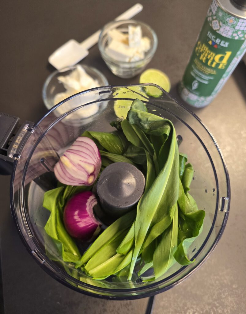 - Bärlauch und Zwiebel in den elektrischen Multi-Zerkleinerer "Up & Down" geben30 gr. Bärlauch ohne Stiele, 1 kleine rote Zwiebel