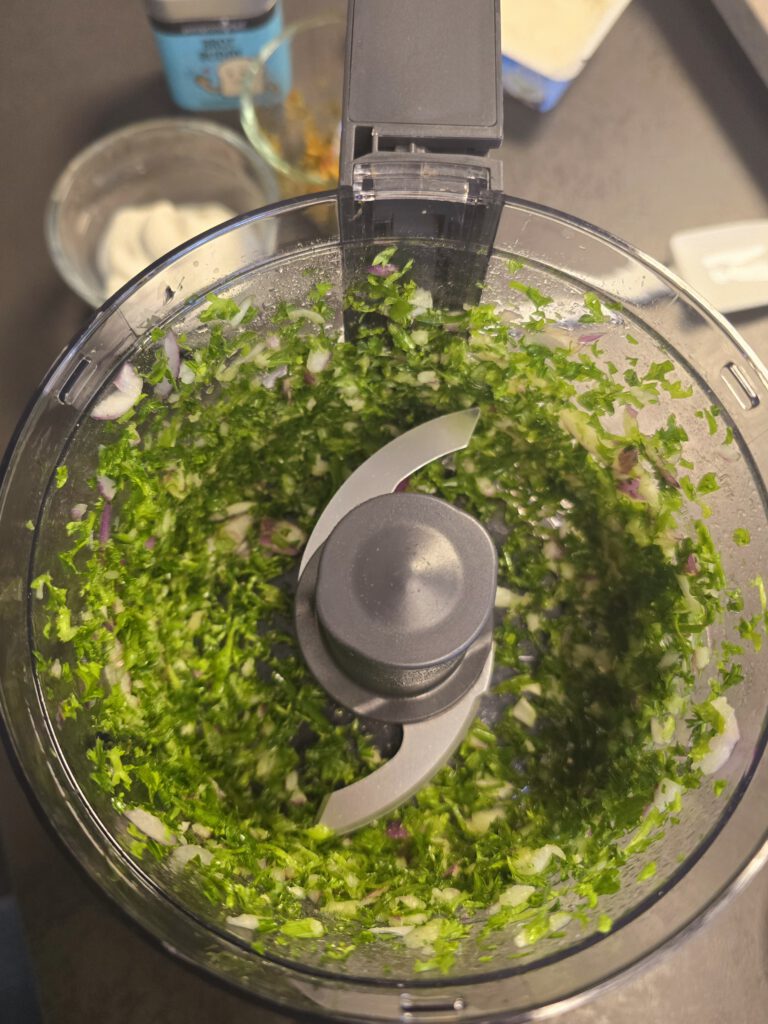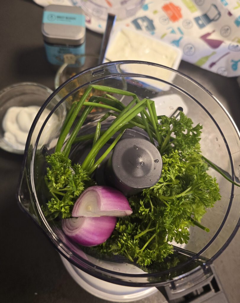 • Petersilie, Schnittlauch und halbierte Zwiebel in den Elektrischen Multi-Zerkleinerer "Up & Down" geben