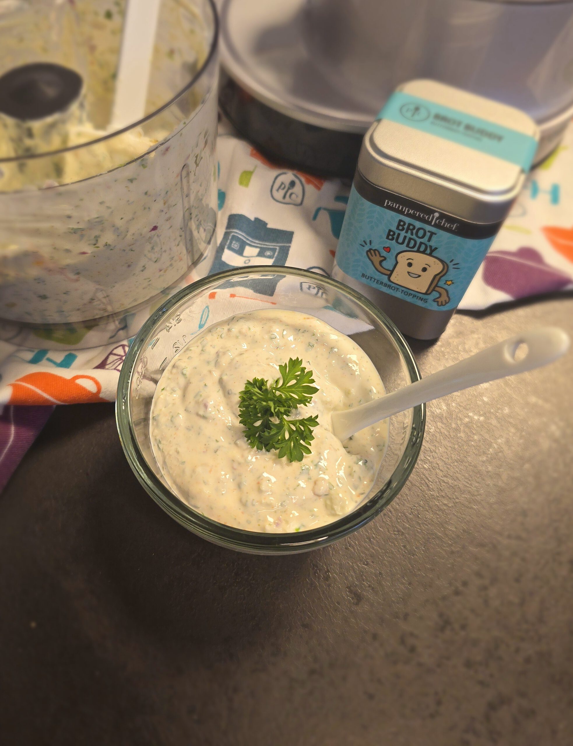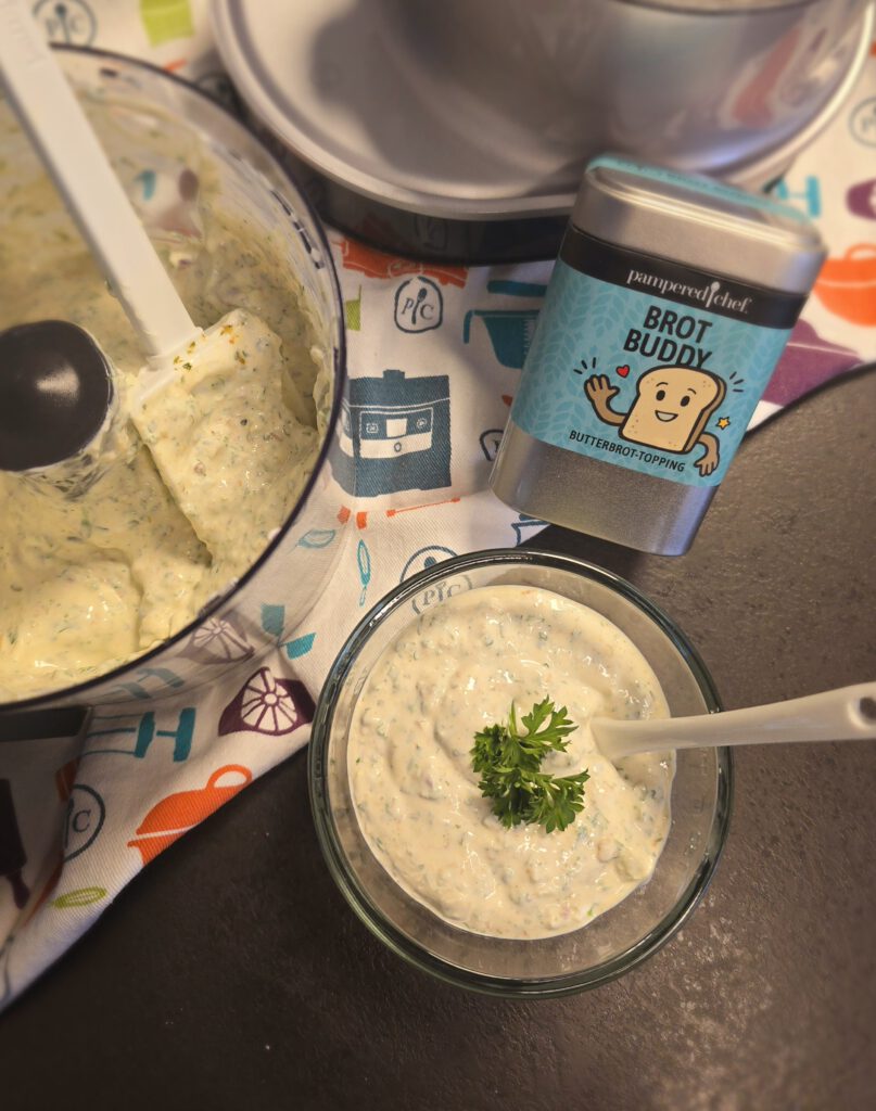 200 gr. Frischkäse leicht, z.B. Buko balance, 100 gr. griechischer Joghurt 2 %, 2 TL Brot Buddy verrührt mit 3 TL Wasser, 1/2 TL Salz