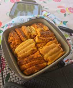 - Die Streifen wie eine Ziehharmonika auffädeln und in die Ofenhexe setzen, abwechseln bestrichene Seite nach oben und unten