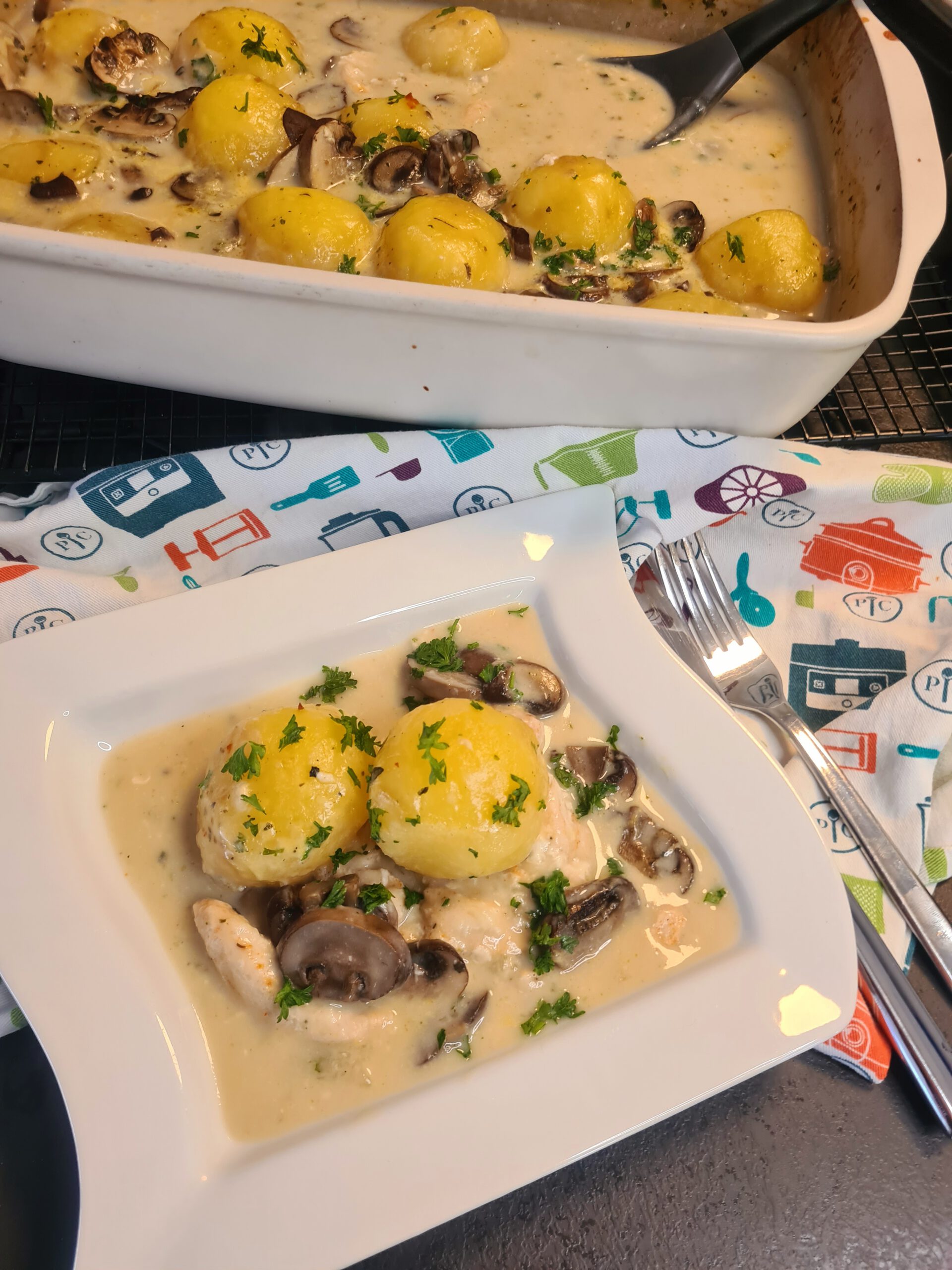 Hähnchengeschnetzeltes mit Miniknödeln und Pilzen