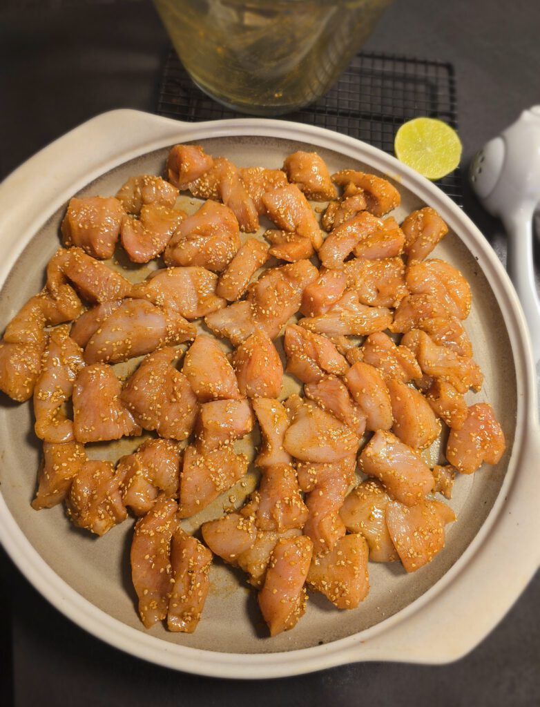 - Marinade zu dem Hähnchen geben, alles gut vermengen und auf der White Lady verteilen