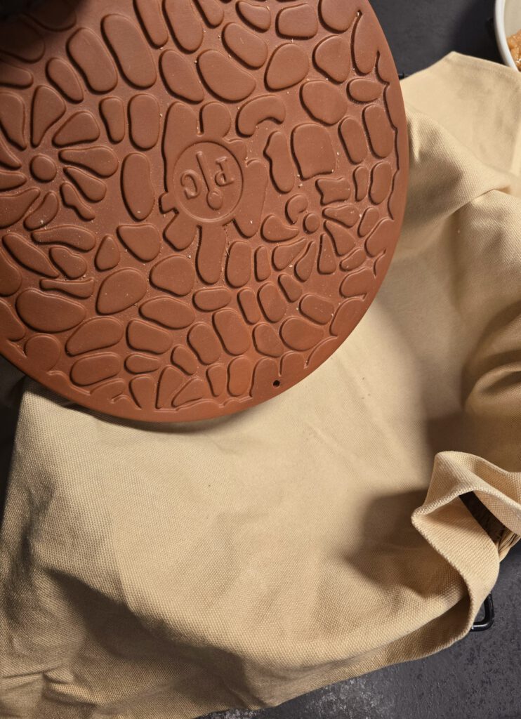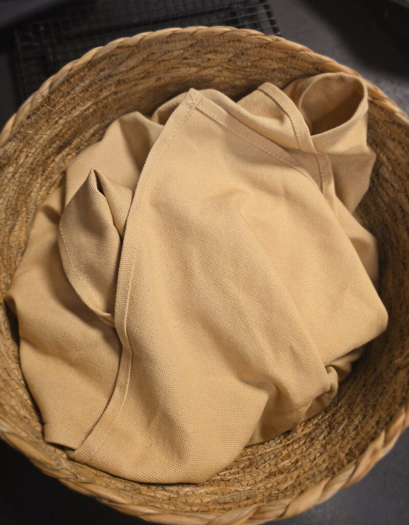 - Stein aus dem Backofen nehmen (Vorsicht heiß) in den Brotkorb legen und mit dem Tuch bedecken