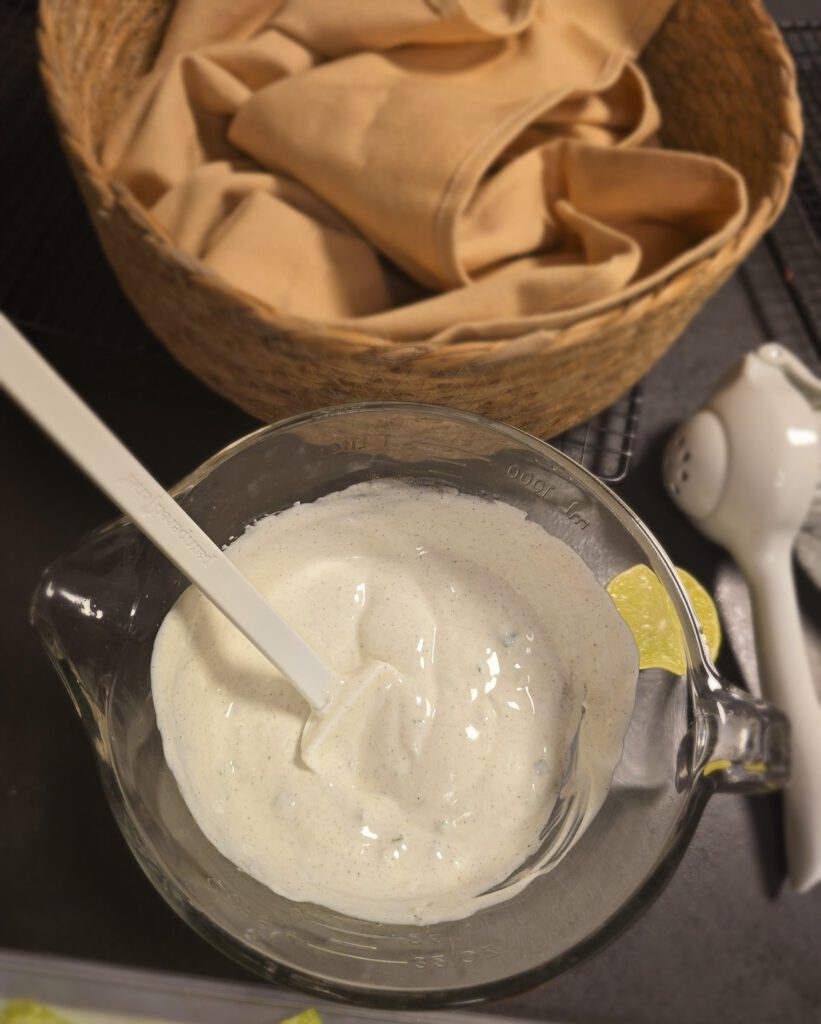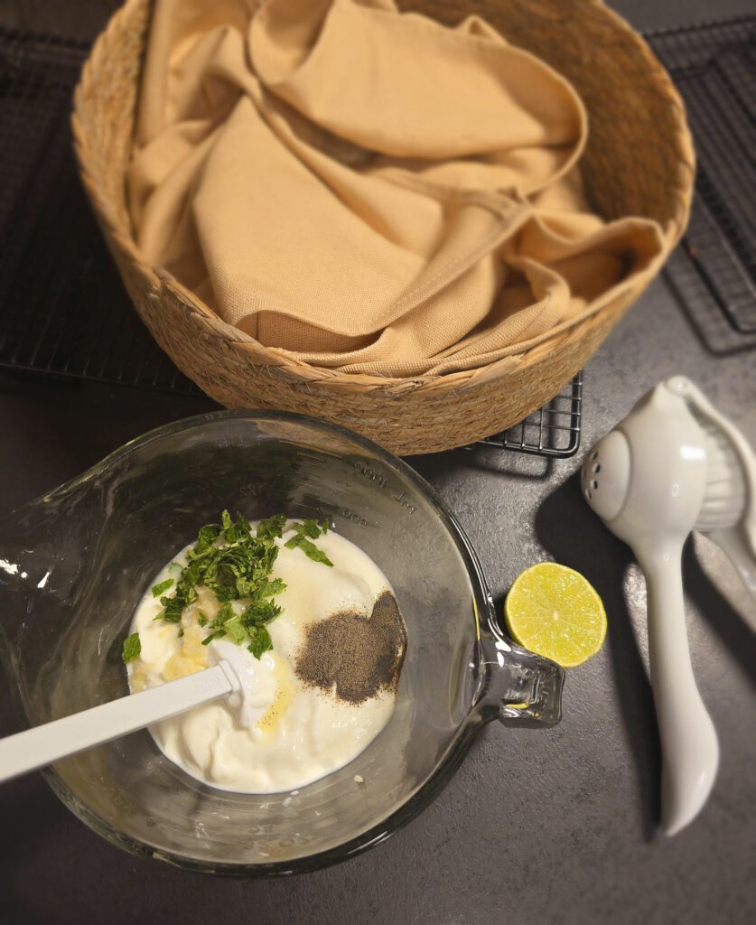 - In dieser Zeit die Joghurtsoße anrühren: Hierfür Joghurt, gehackte Minze, gepresste Knoblauchzehen, Limettensaft, Salz und Pfeffer in die Nixe geben400 gr. griechischer Joghurt, 10 Blatt Minze, 2 Knoblauchzehen, 2 TL Limettensaft, 1 TL Salz, 1/2 TL Pfeffer