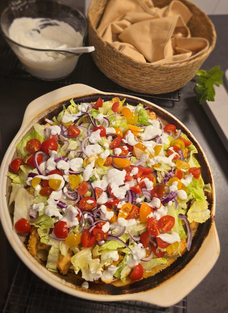 - Salat, Zwiebel, Tomaten und die Joghurtsoße darüber verteilen