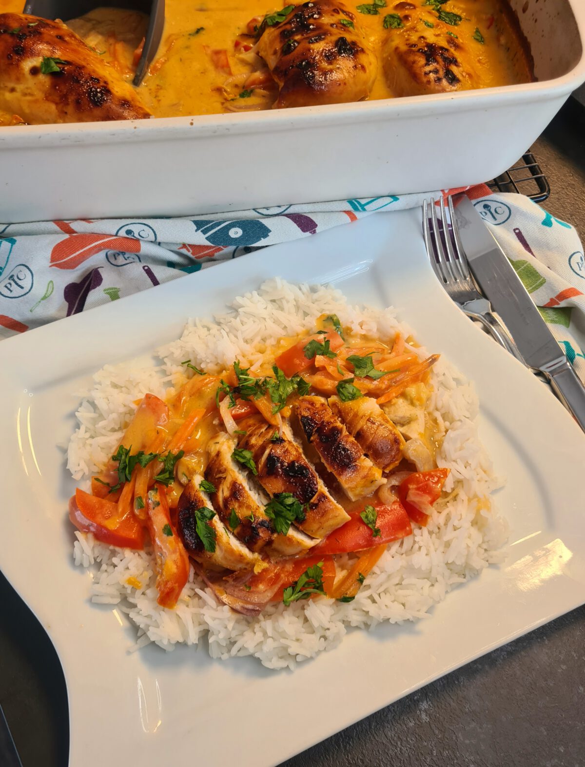 Honig-Senf-Hähnchen mit Gemüse in Frischkäsesoße / Beilage Reis