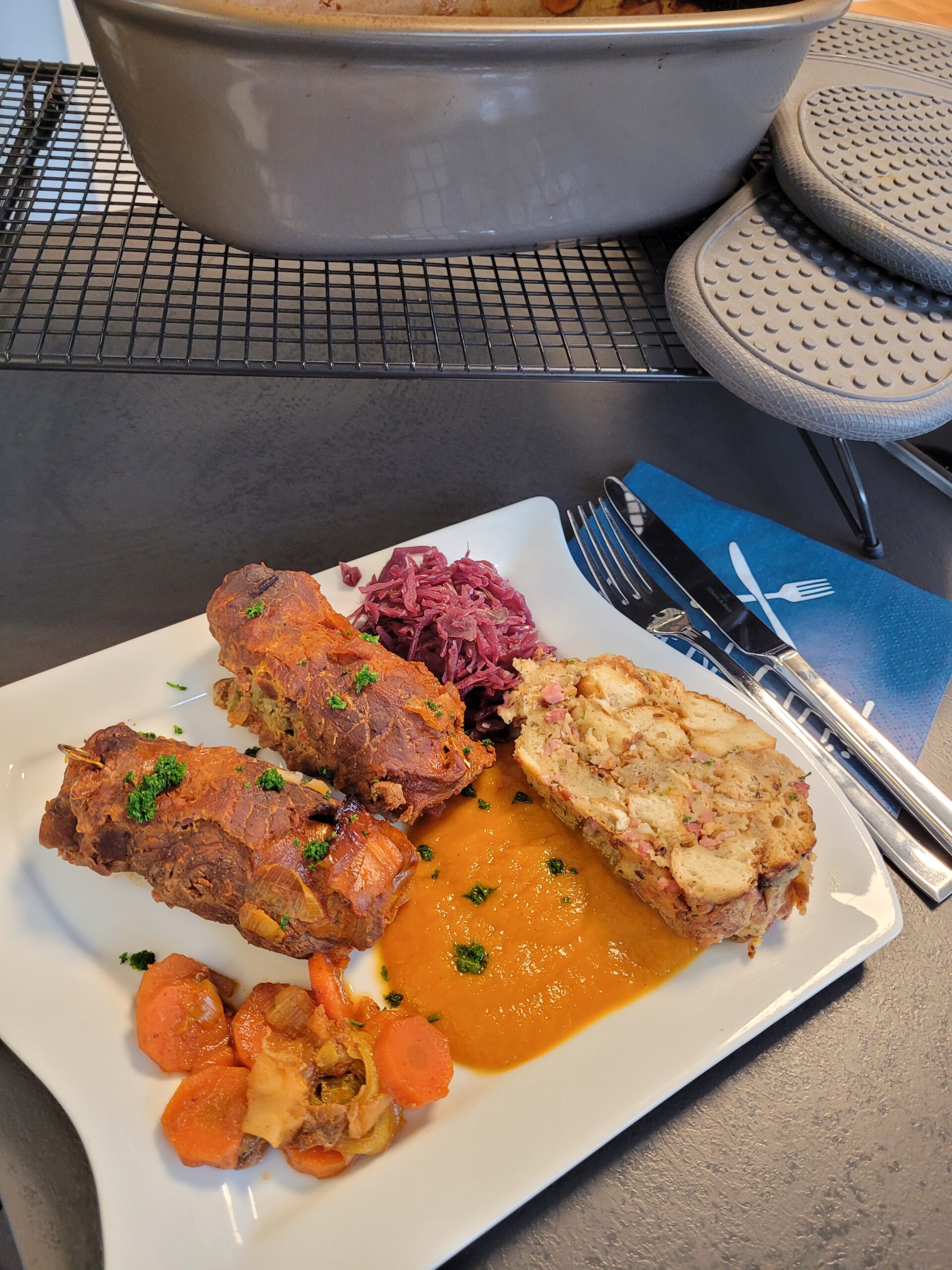 - Ofenmeister heraus nehmen, Rouladen aus dem Ofenmeister nehmen