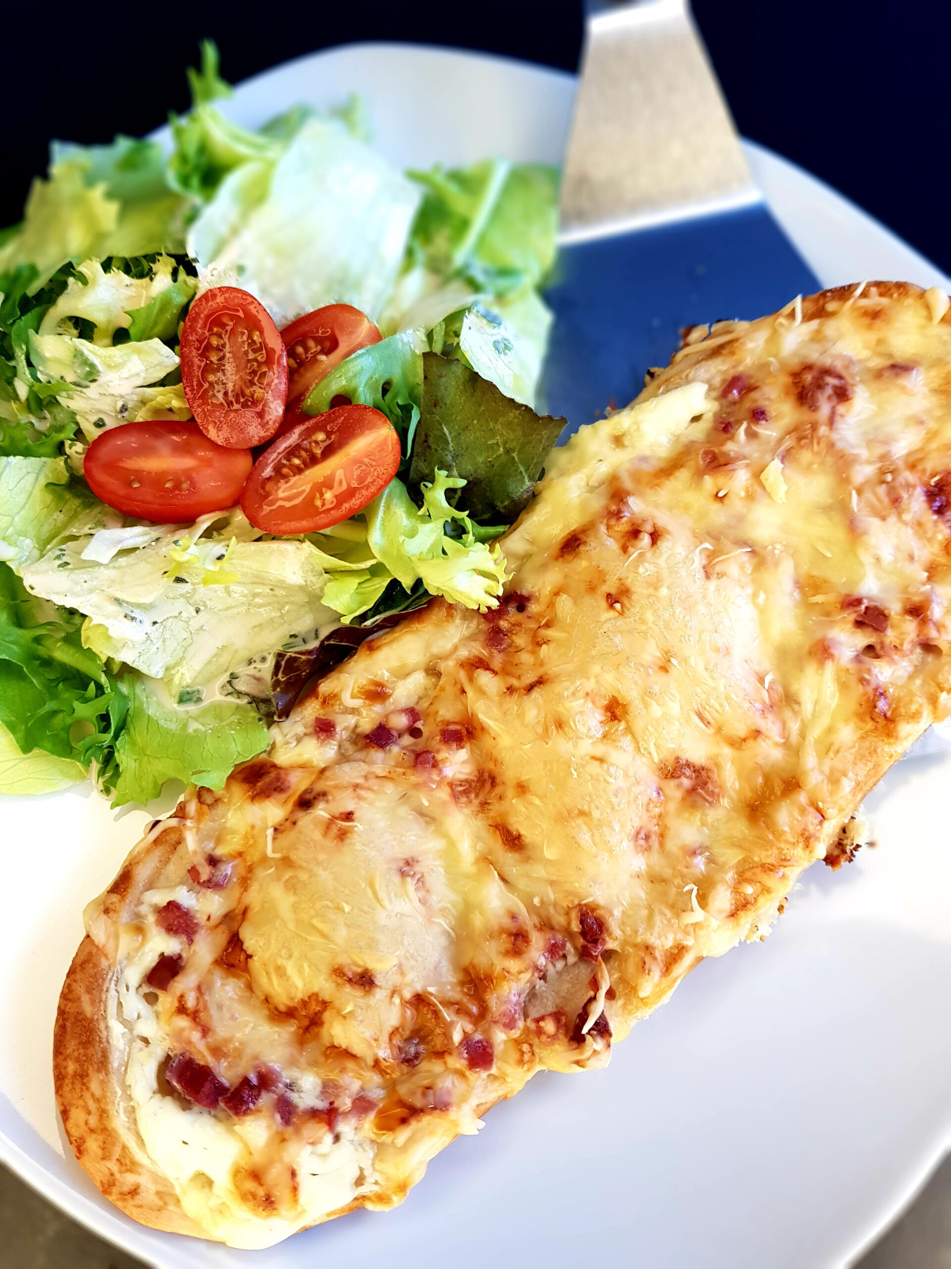 - Nach Wunsch belegen und mit geriebenem Käse bestreuenSpeckwürfel, Frühlingszwiebel, Salami, geriebenen Käse