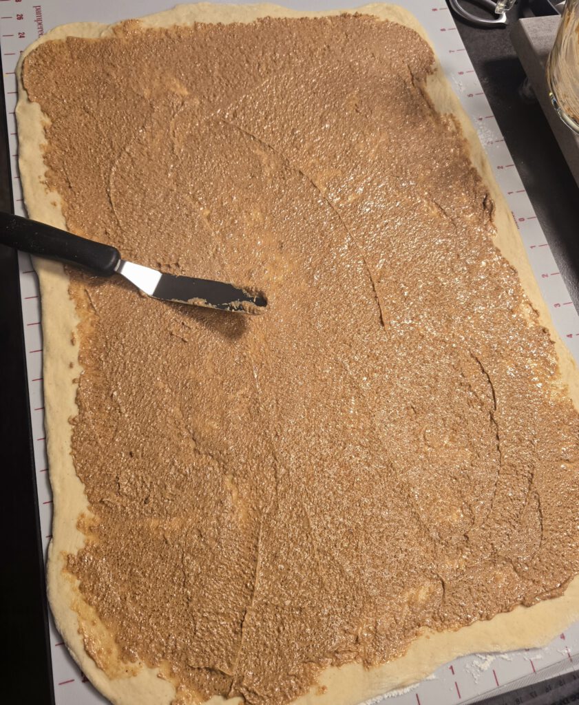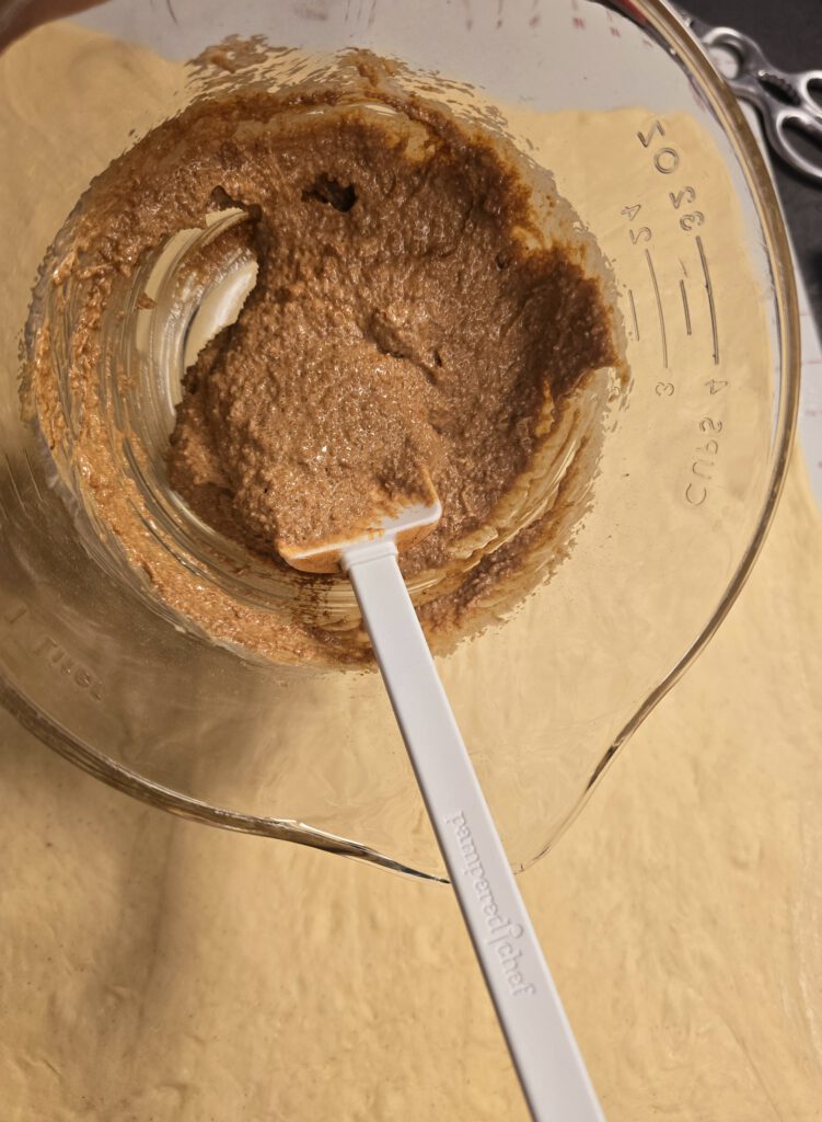 - Die Mischung mit dem kleinen Streicher auf den Teig streichen