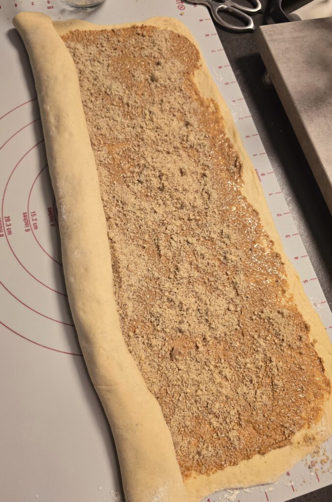 - Nun mit dem Teigroller ausrollen. Etwa 50 cm lang und 35 cm hoch