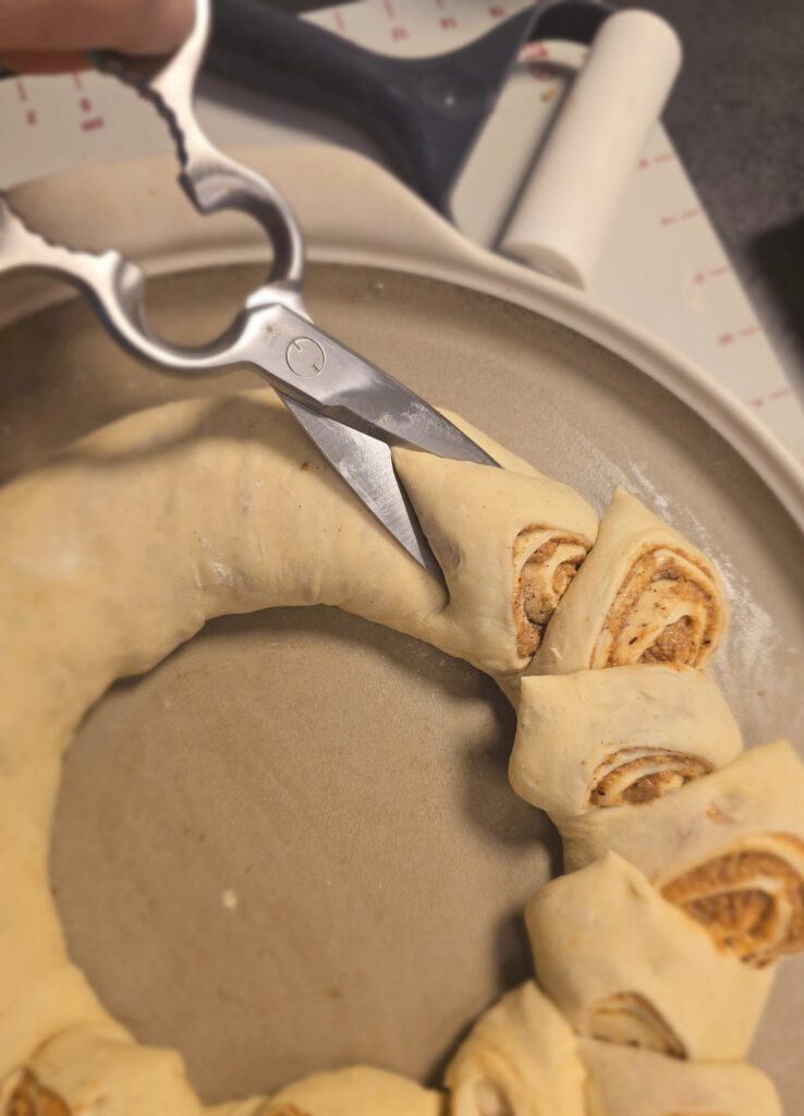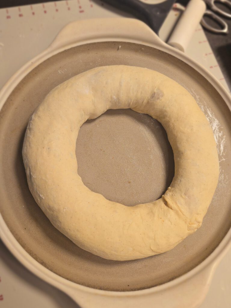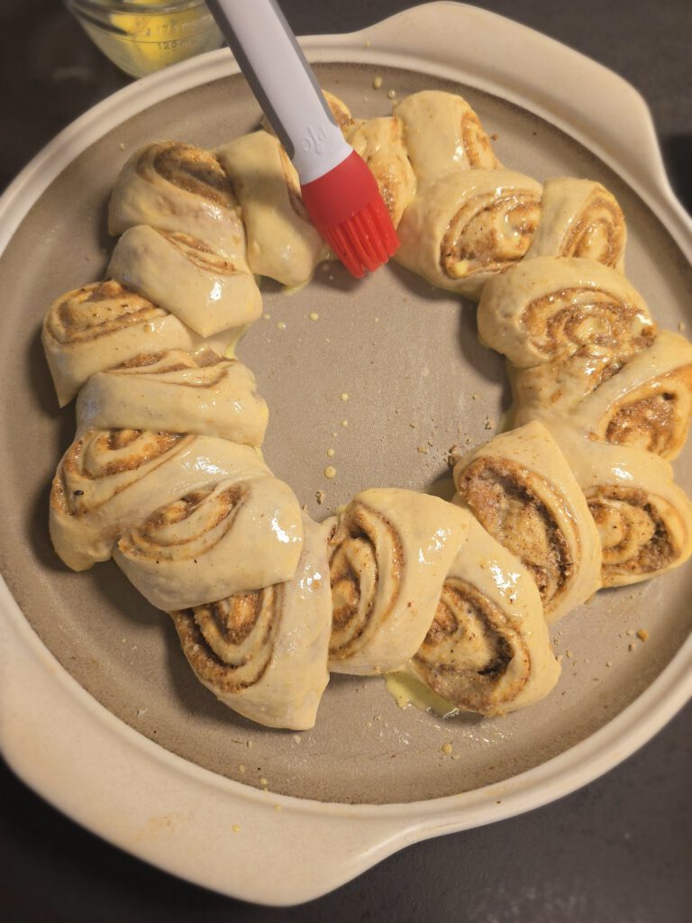 - Hefekranz mit der Eigelb/Milch-Mischung bestreichen1 Eigelb verquirlt mit einem Schuss Milch