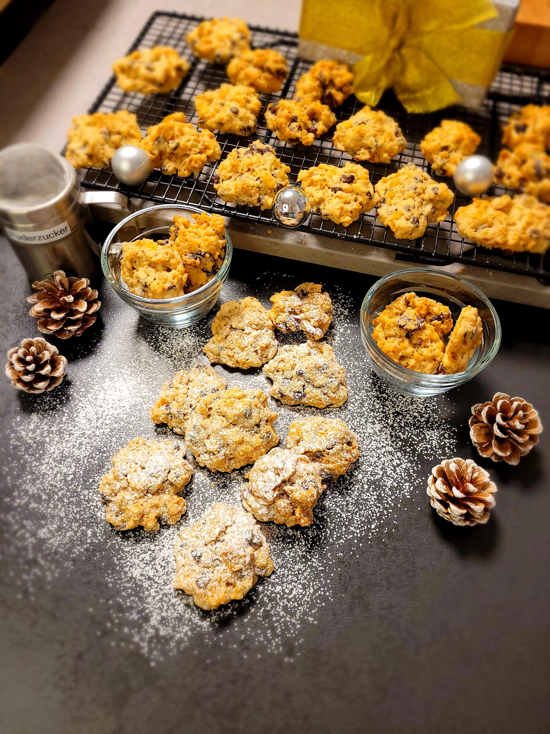 - Zum anderen Teig Cranberries nach Geschmack dazu geben, vermengenDann 70-80 gr. Cornflakes dazu geben und von Hand vermengenCranberries getrocknet, 70 gr. Cornflakes für die andere Hälfte des Teiges
