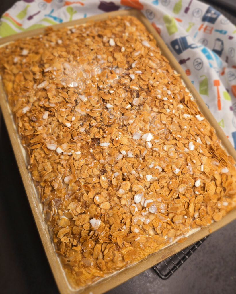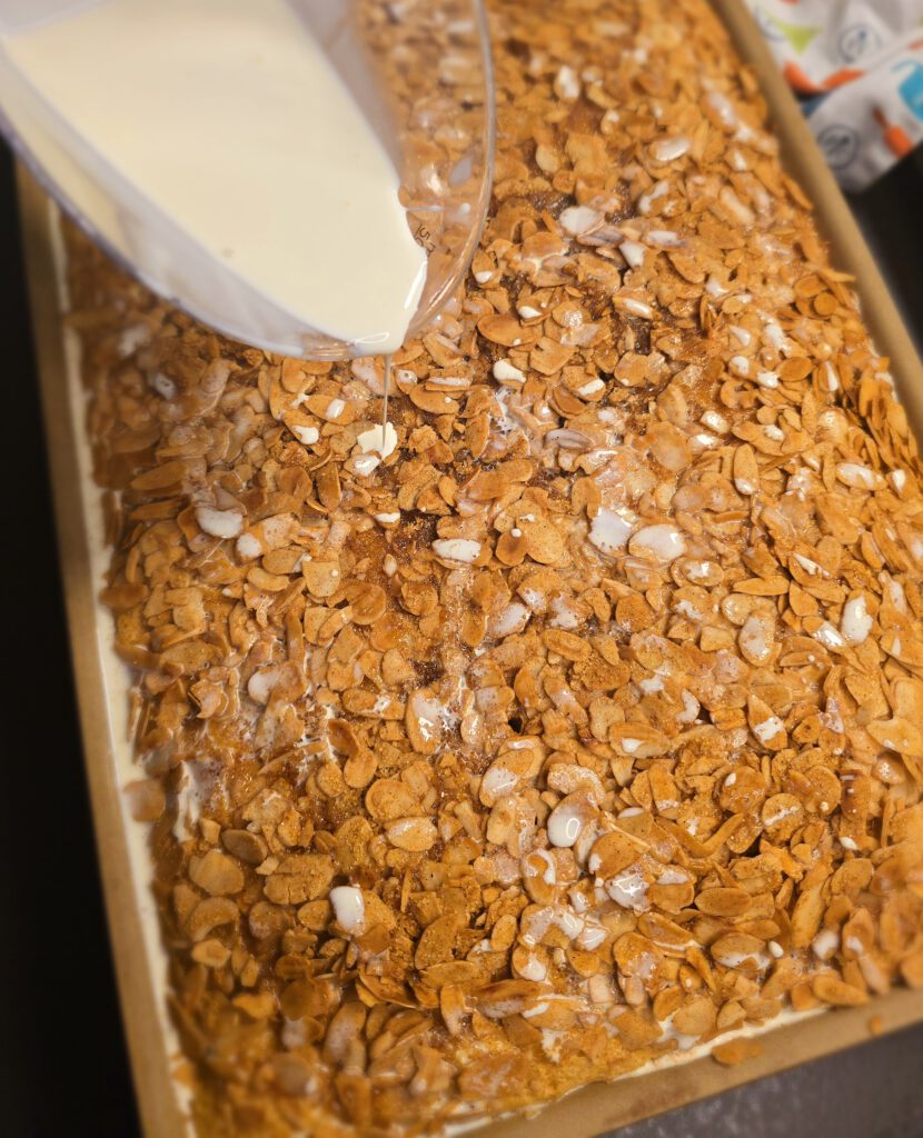 - Großen Ofenzauberer aus dem Backofen nehmen und sofort Cremefine vorsichtig darüber verteilen200 ml Cremefine zum Schlagen