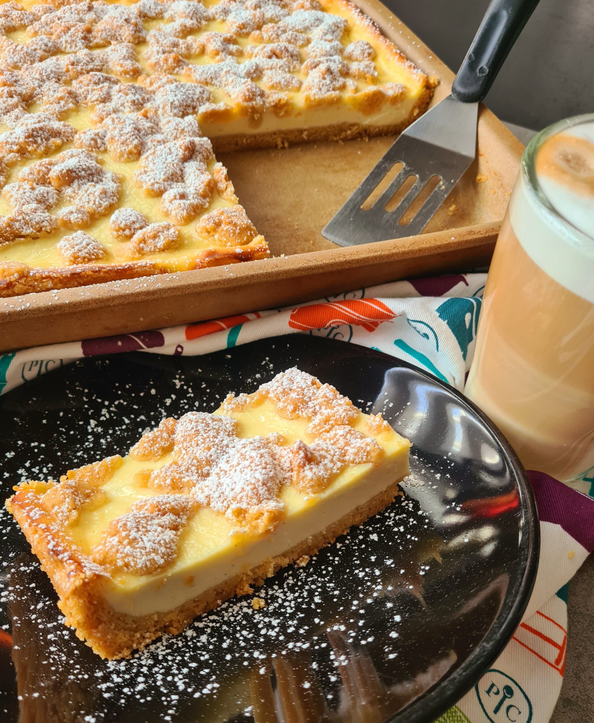 - Den restlichen Teig zu Streusel zupfen und auf der Creme verteilen