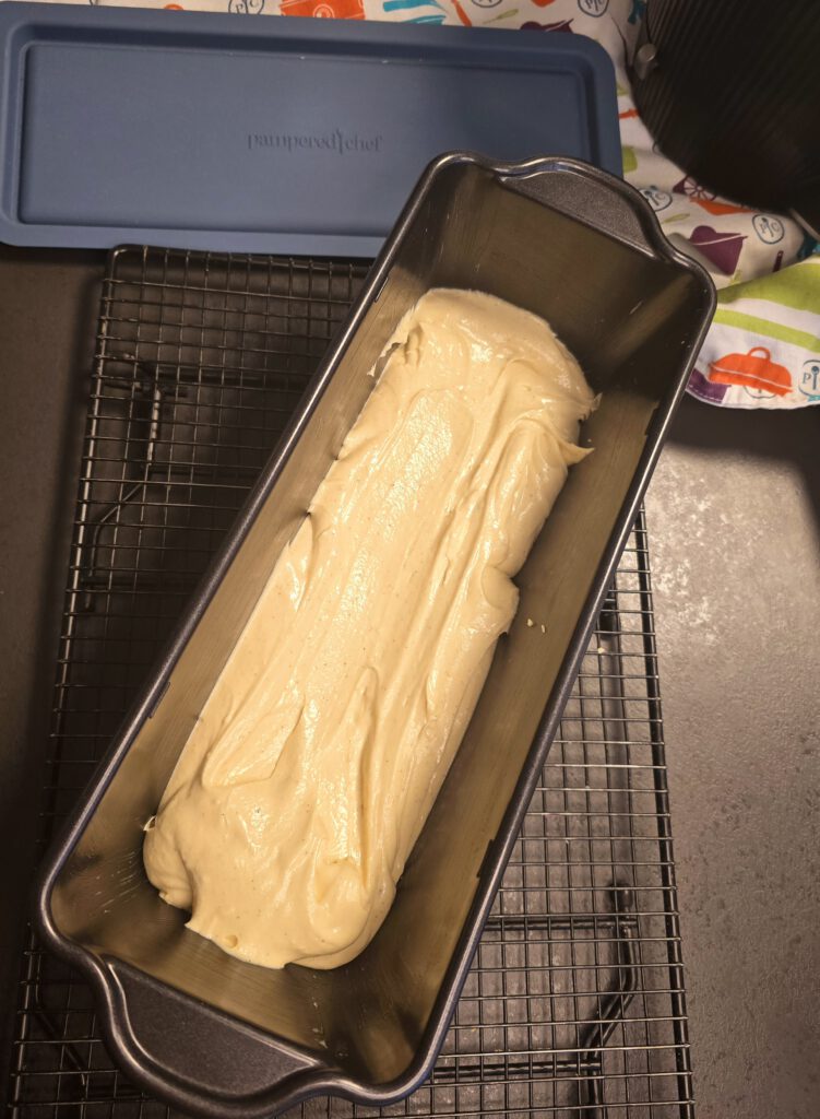 - Etwas mehr als die Hälfte des Teiges in die Kastenform geben und glatt streichen