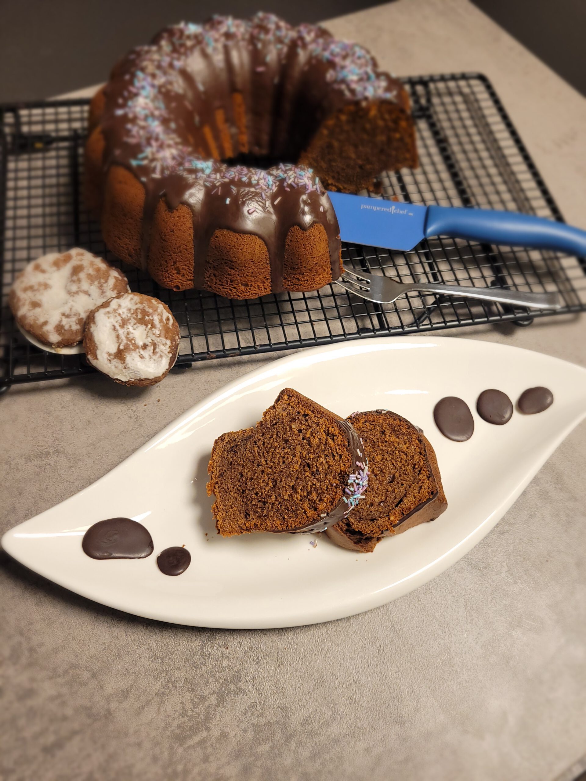- Kurz in der Form abkühlen lassen und noch warm aus der Form stürzen.Auf einem Kuchengitter komplett auskühlen lassen