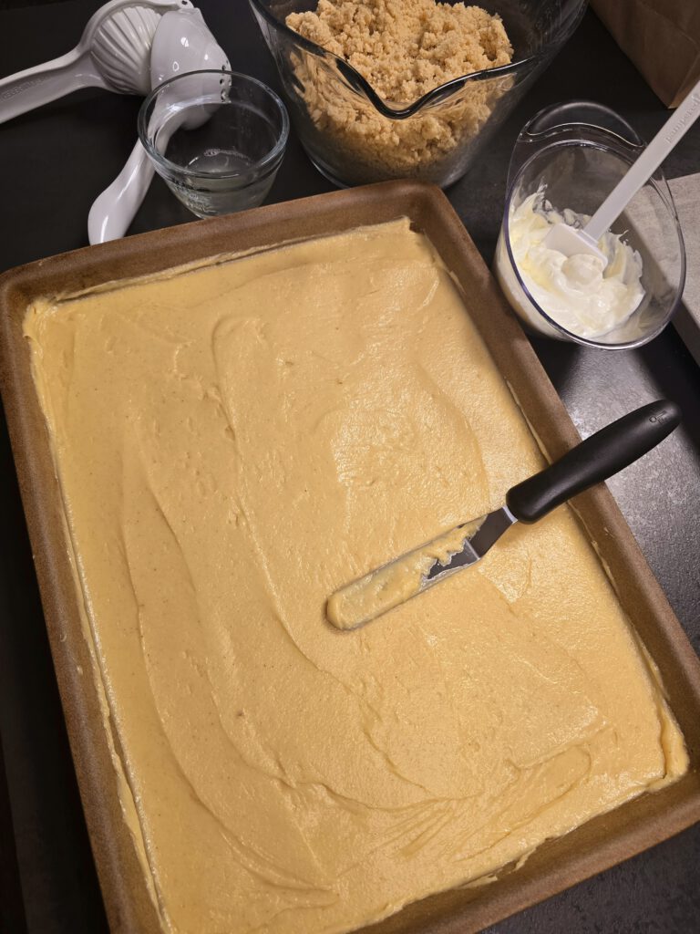 - Teig auf den großen Ofenzauberer geben, mit dem kleinen Streicher glatt streichen