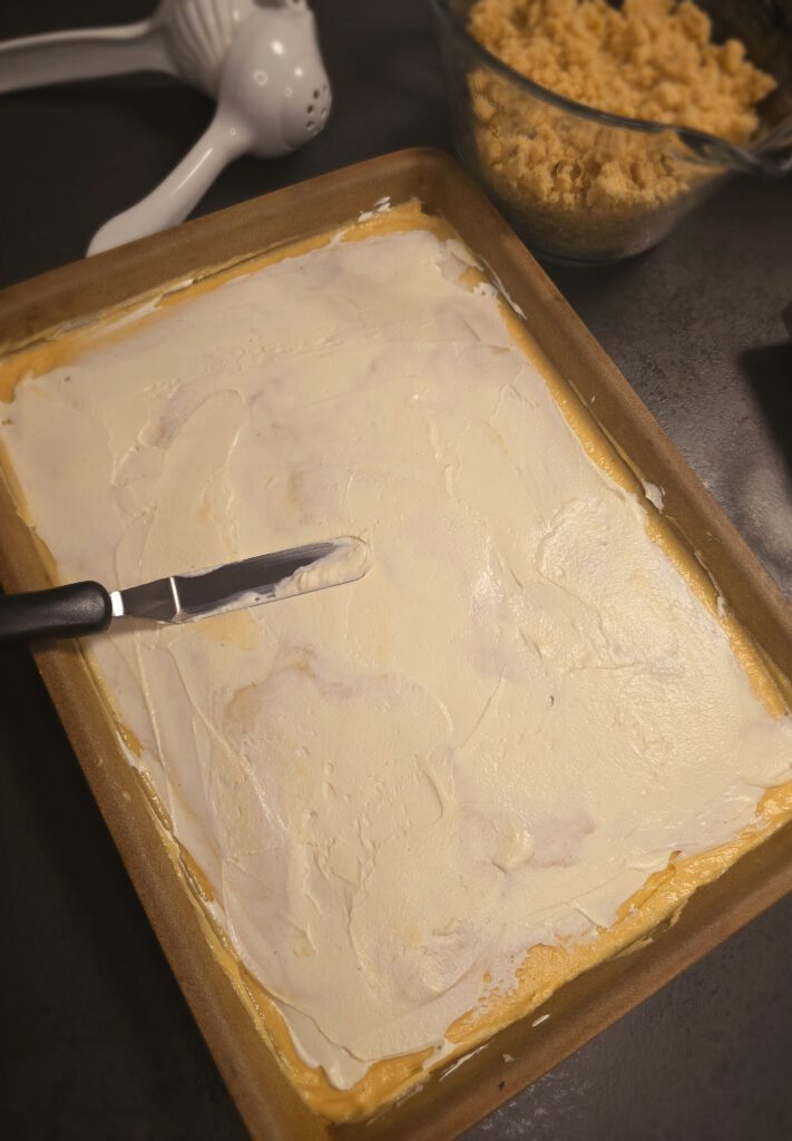 - In Klecksen auf dem Teig verteilen und vorsichtig mit dem kleinen Streicher verteilen