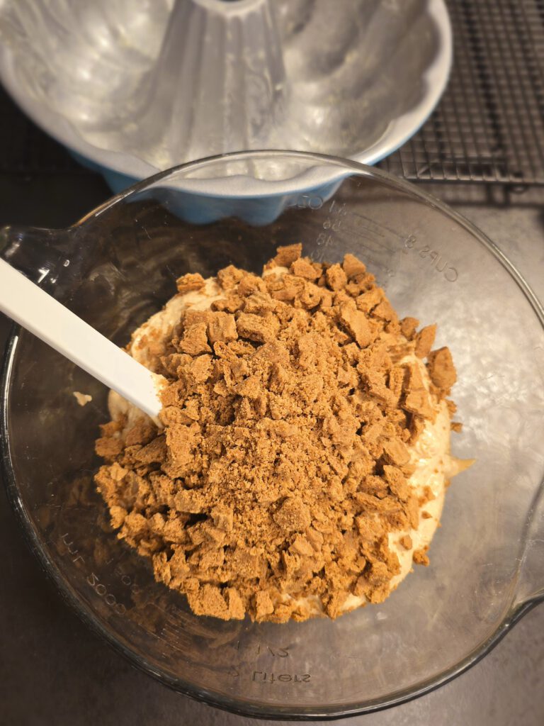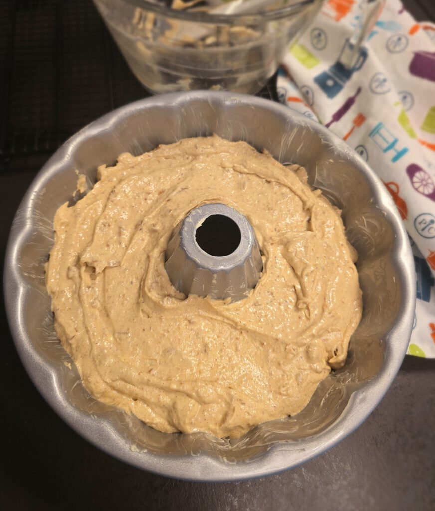 - Teig in die Kranzform füllen und etwas glatt streichen