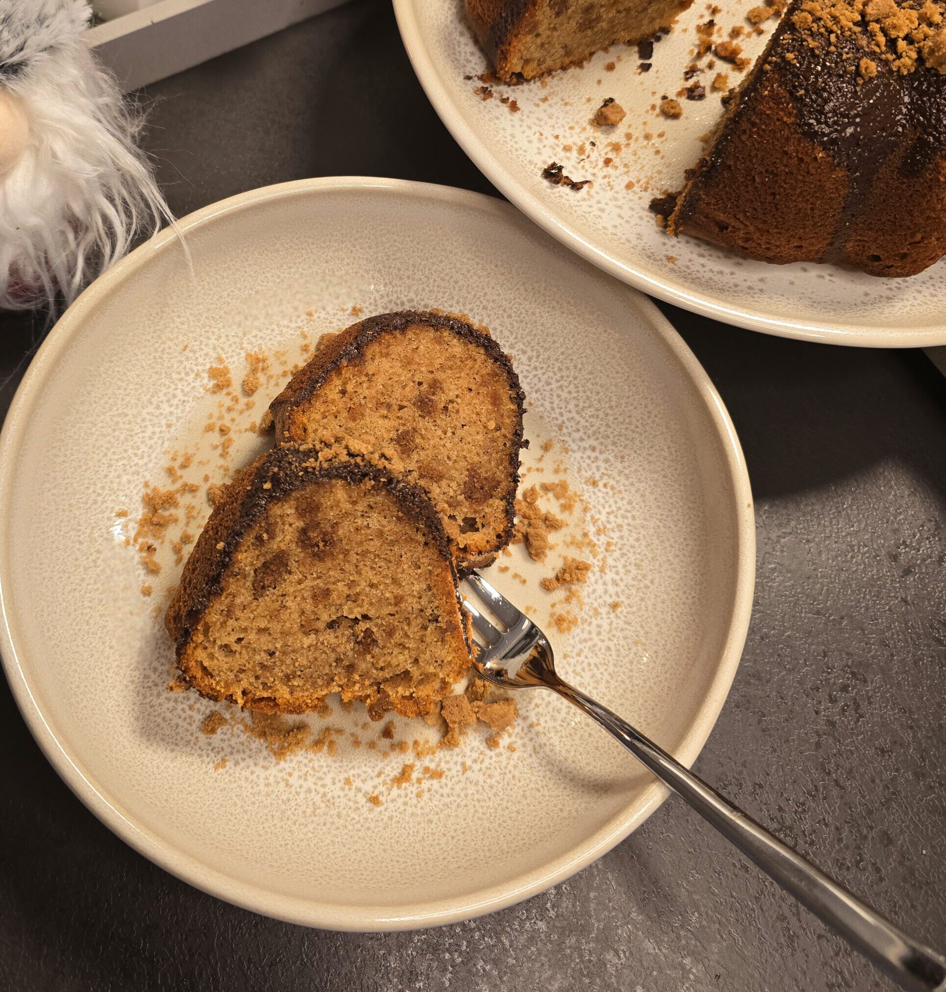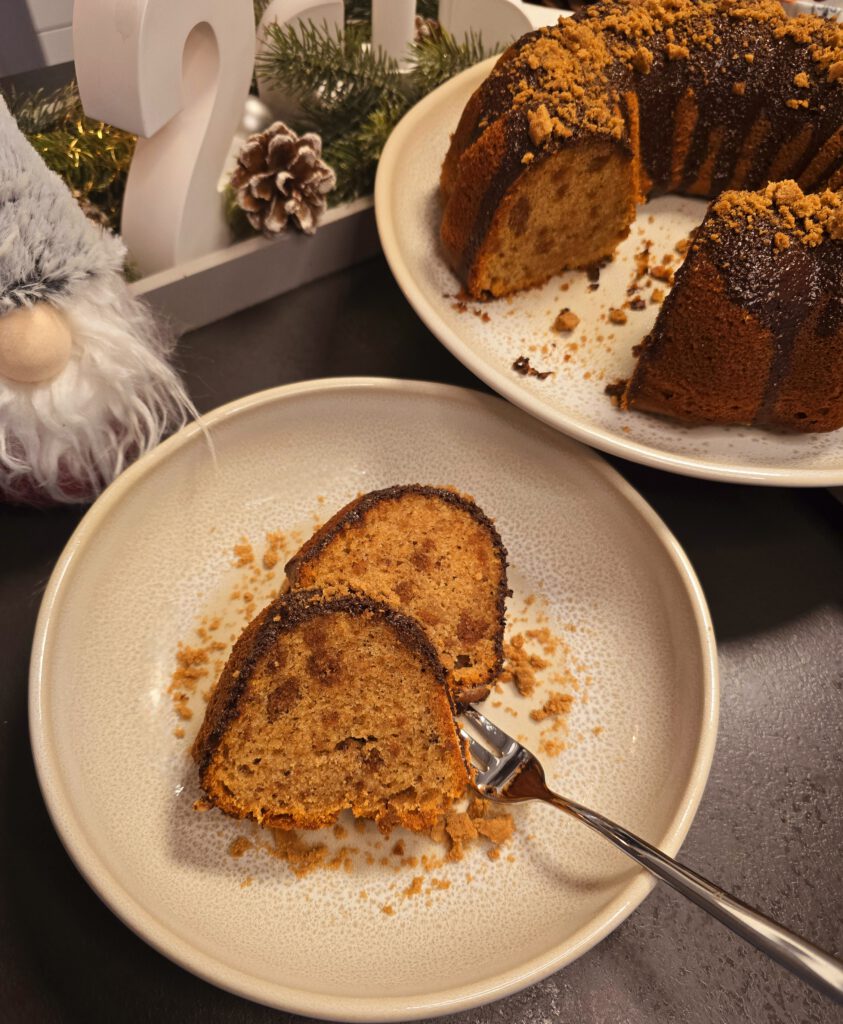 - Sobald der Kuchen abgekühlt ist mit Schokoguss überziehen und gehackte Spekulatius als Deko darüber verteilenSchokoguss Zartbitter, 5 Spekulatius gehackt als Deko