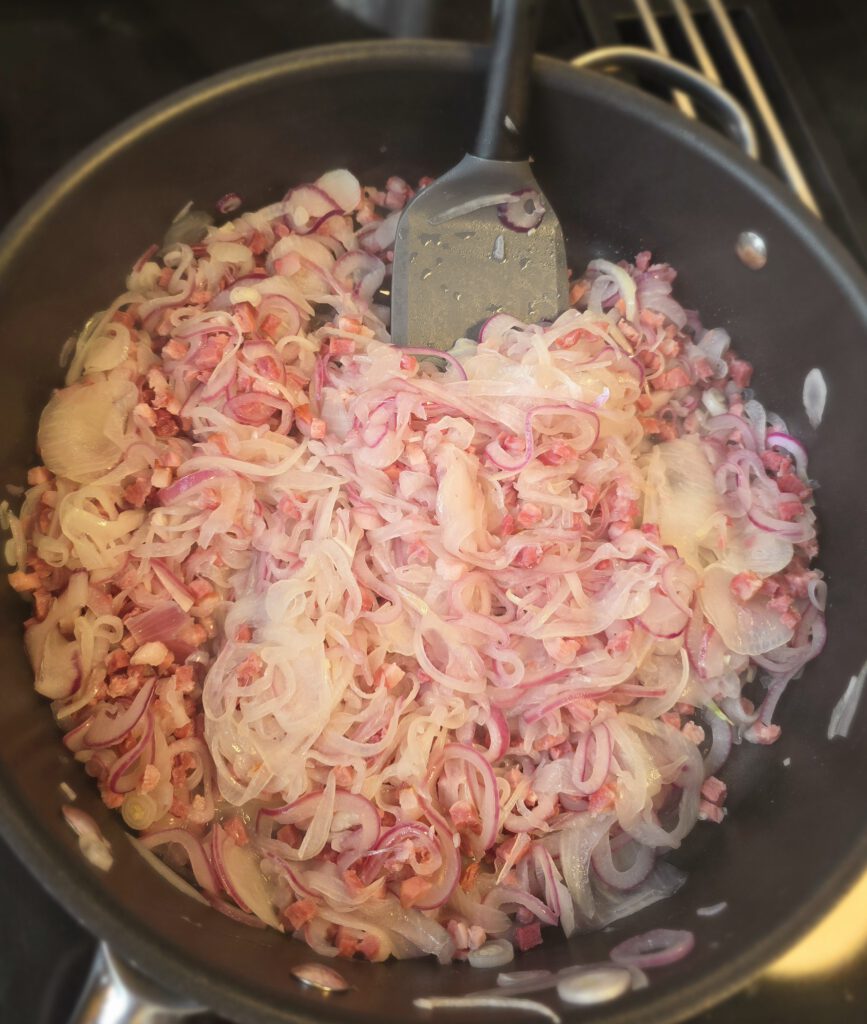 - Speck in die Pfanne geben und anbraten, dann Zwiebeln dazu geben250 gr. Speck